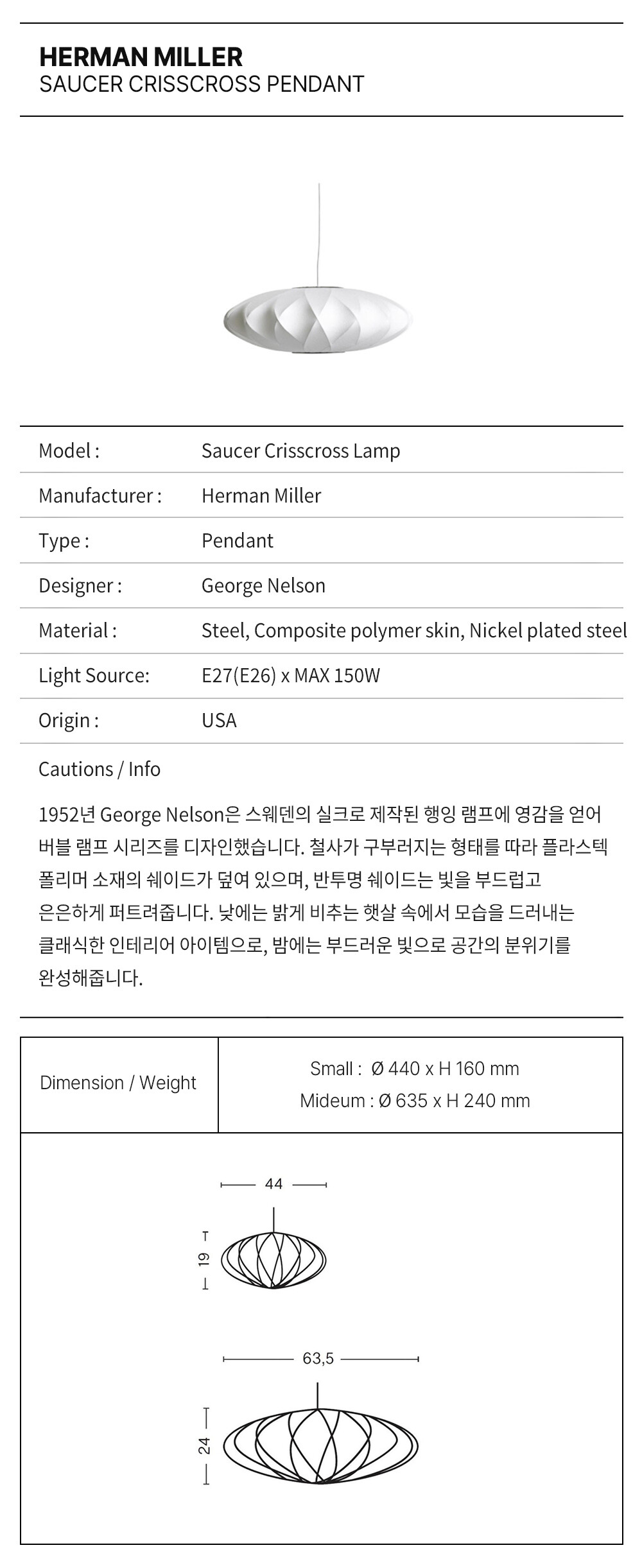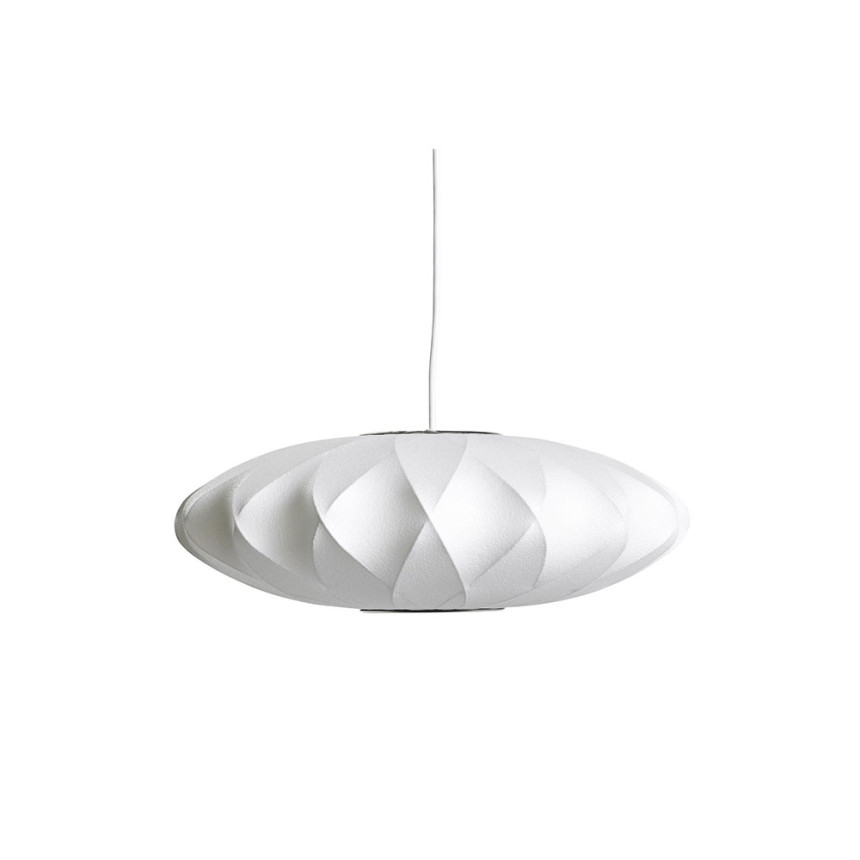조지 넬슨의 클래식한 디자인인 넬슨 소서 크리스크로스 버블 펜던트는 하부 구조에 양분되는 패턴이 있어 램프갓에 아름다운 윤곽을 더합니다. 이 펜던트 조명은 1.8m 길이의 코드가 있어 천장에 부착하여 머리 위로 부드럽게 떠 있을 수 있습니다. 넬슨은 1952년, 스웨덴식 행잉 램프 세트를 보고 감탄하며 버블 램프를 처음 디자인했습니다. 비싼 가격에 매료된 넬슨은 직접 디자인하게 되었습니다. 그 결과, 원초적인 구형의 모양들이 탄생했습니다.