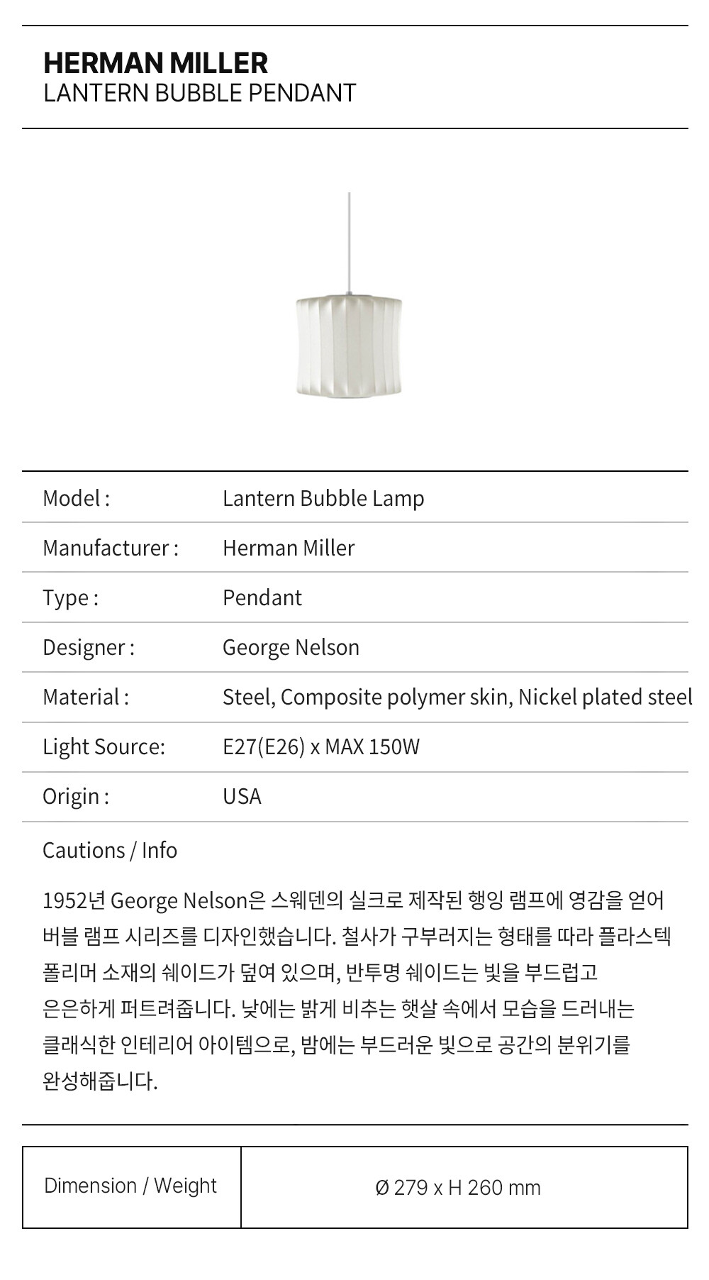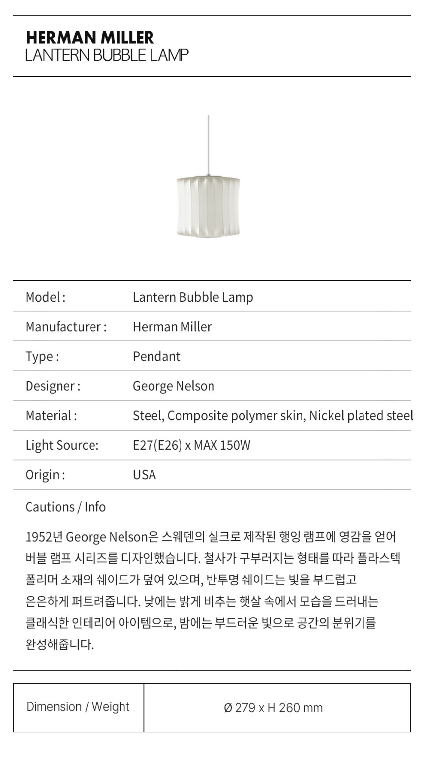 전통 랜턴 갓의 심플하고 우아한 형태에 현대적인 감각을 더한 넬슨 랜턴 버블 펜던트는 1.8미터 길이의 코드와 천장판을 사용하여 섬세하게 천장에 매달려 있습니다. 조지 넬슨은 1952년 버블 램프를 디자인했습니다. 그는 실크 커버로 정교하게 제작된 스웨덴식 행잉 램프 세트에서 영감을 얻었습니다. 하지만 더 큰 문제는 높은 가격이었습니다. 넬슨은 직접 세트를 제작하기로 결심하고 실크 갓을 반투명 플라스틱 소재로 대체하는 혁신적인 방법을 고안했습니다.