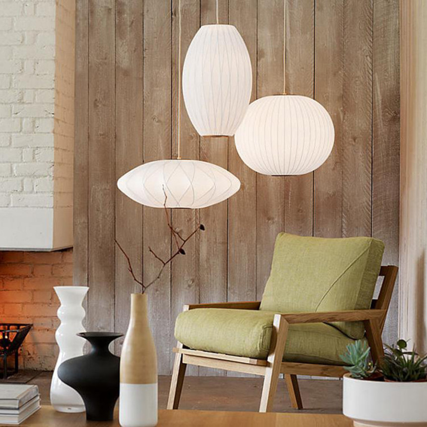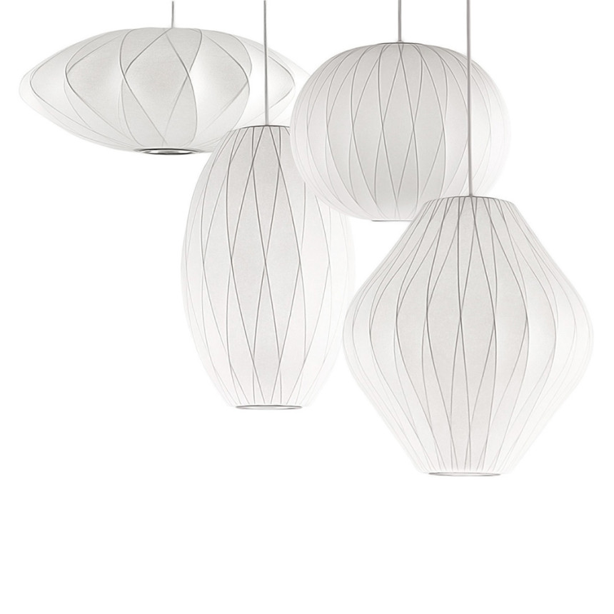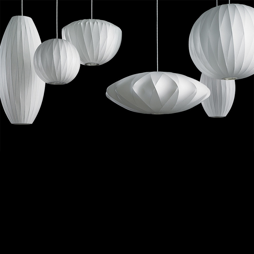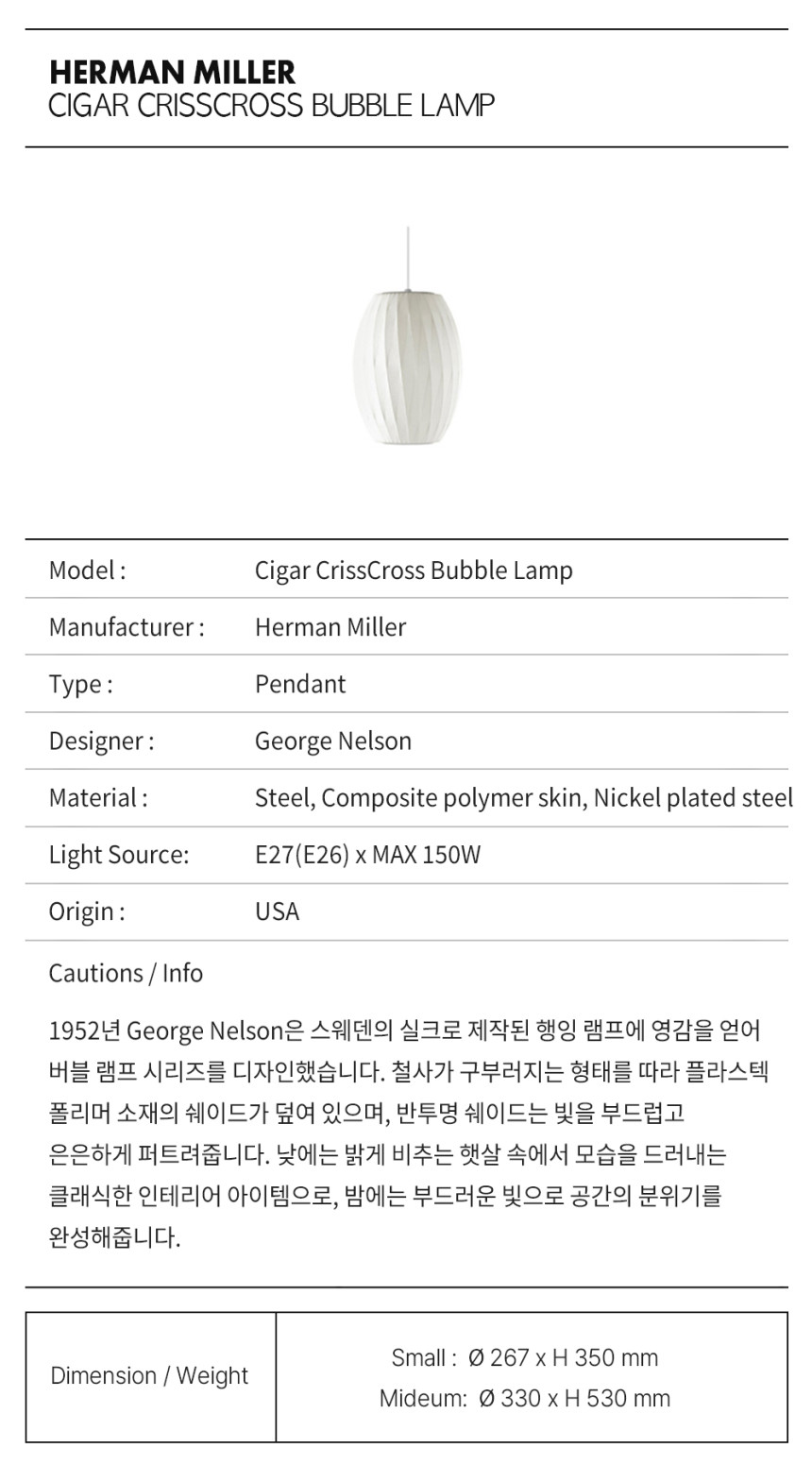 넬슨 시가 크리스크로스 버블 펜던트는 두 가지 크기로 출시되며, 천장에 고정할 수 있는 스틸 천장판과 1.8m 길이의 코드가 함께 제공됩니다. 조지 넬슨은 1952년, 사무실에 놓을 스웨덴식 행잉 램프를 우연히 발견하면서 버블 램프를 처음 디자인했습니다. 비싼 가격에 고민하던 그는 직접 만들기로 결심했습니다. 그 결과, 둥근 사과, 넓은 접시, 균형 잡힌 배 등 원초적인 구형의 디자인이 탄생했습니다.