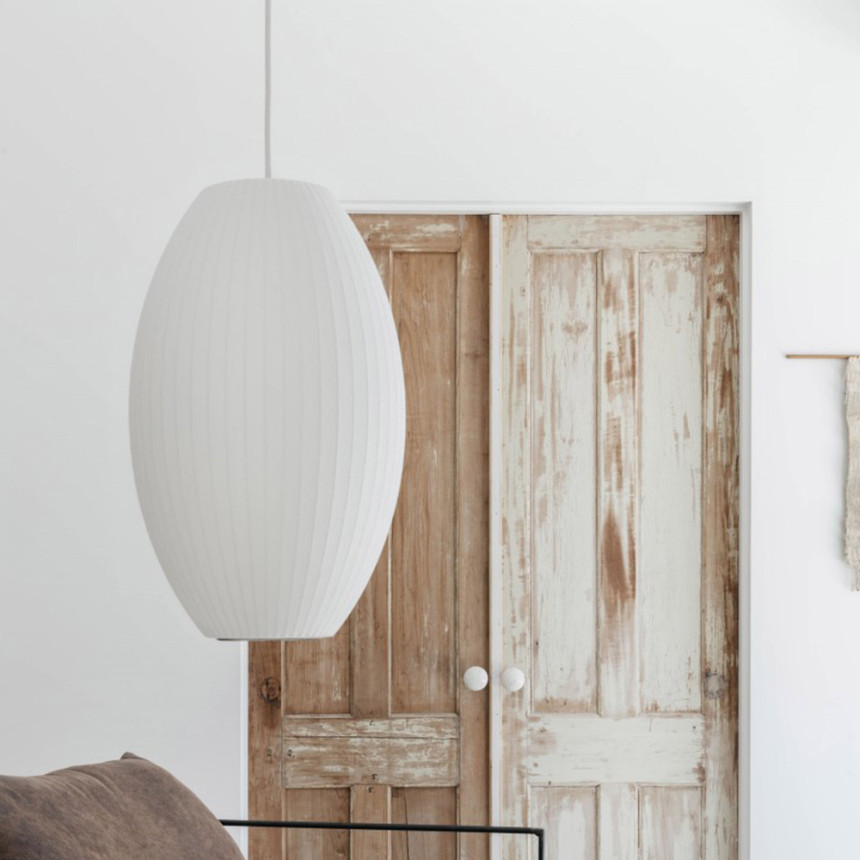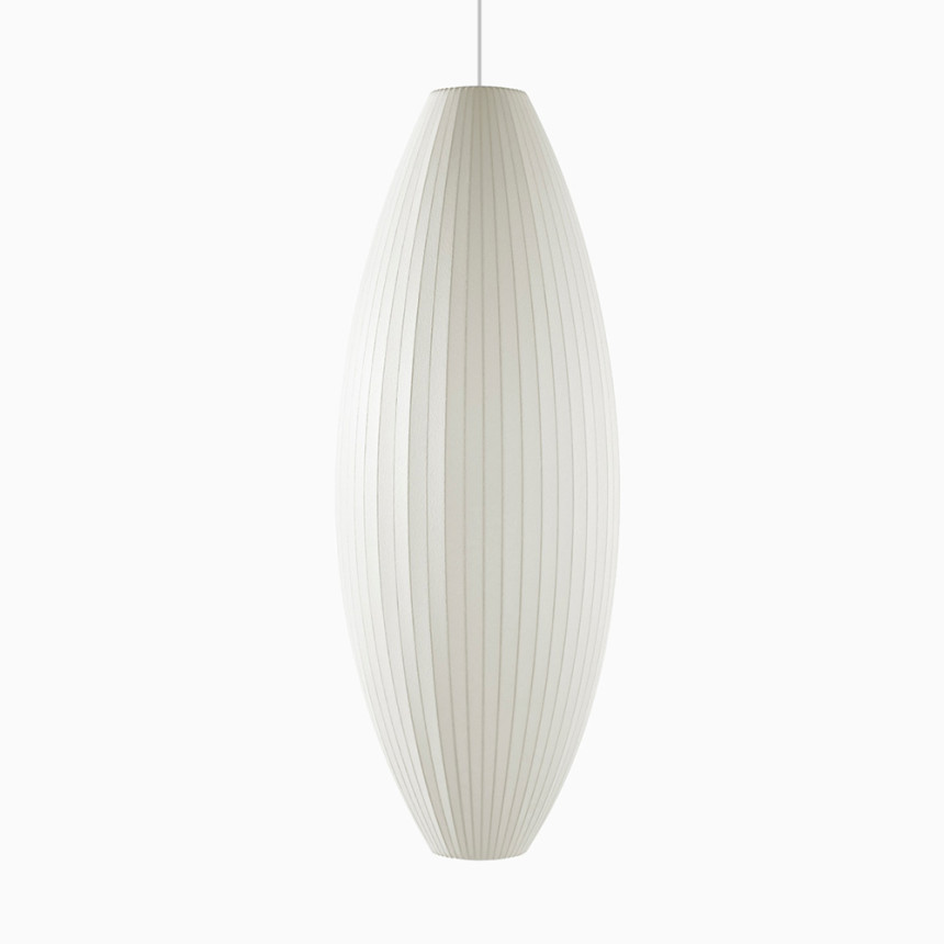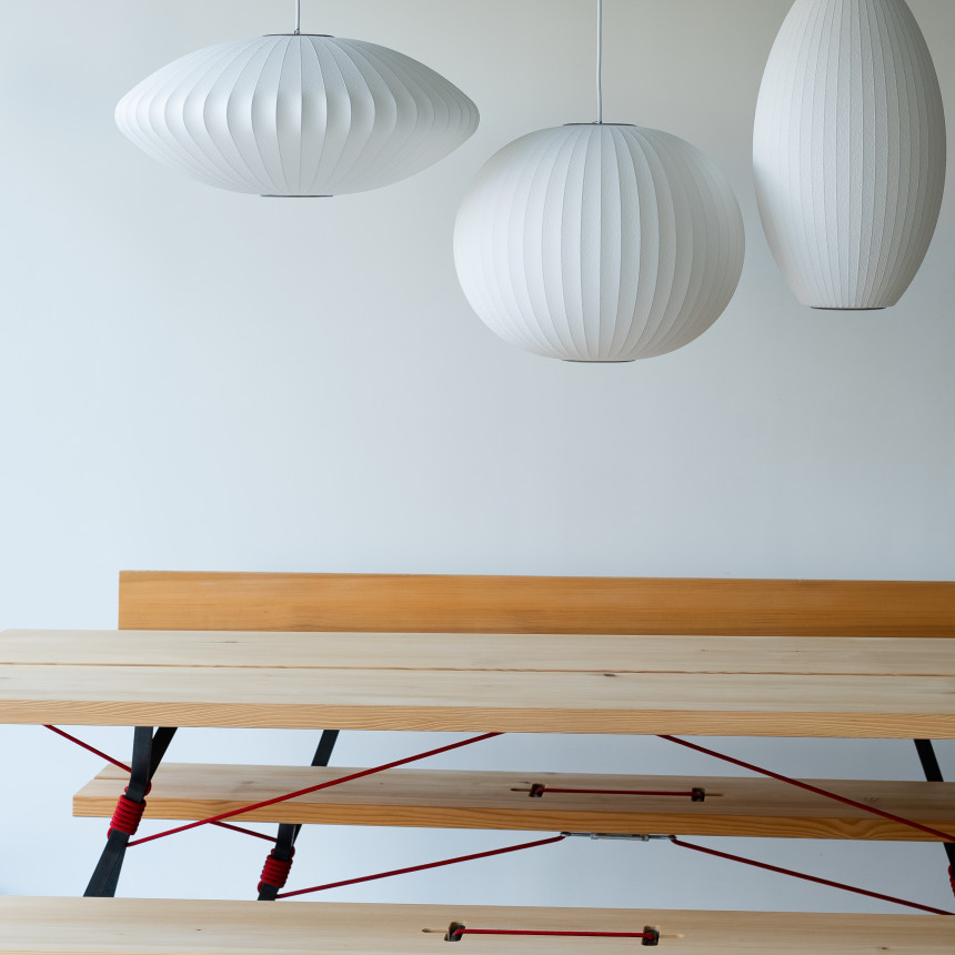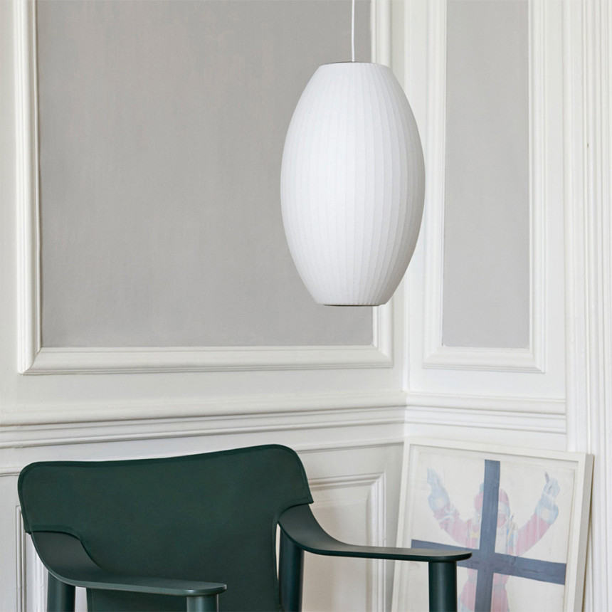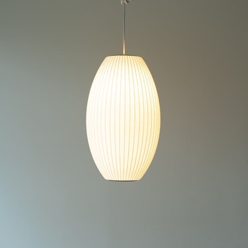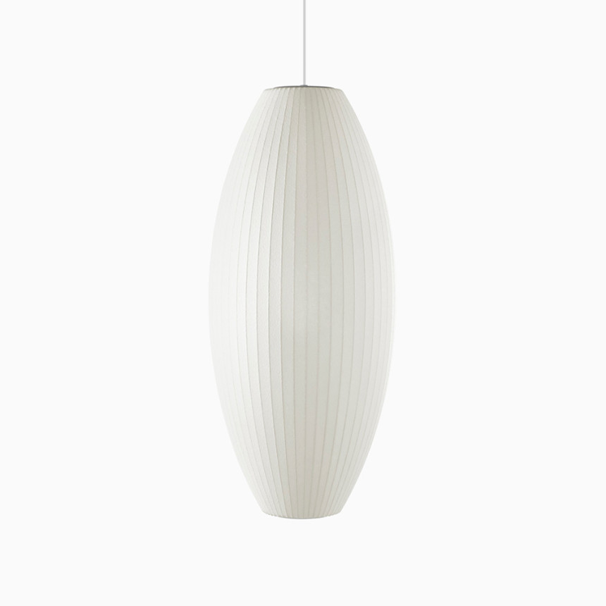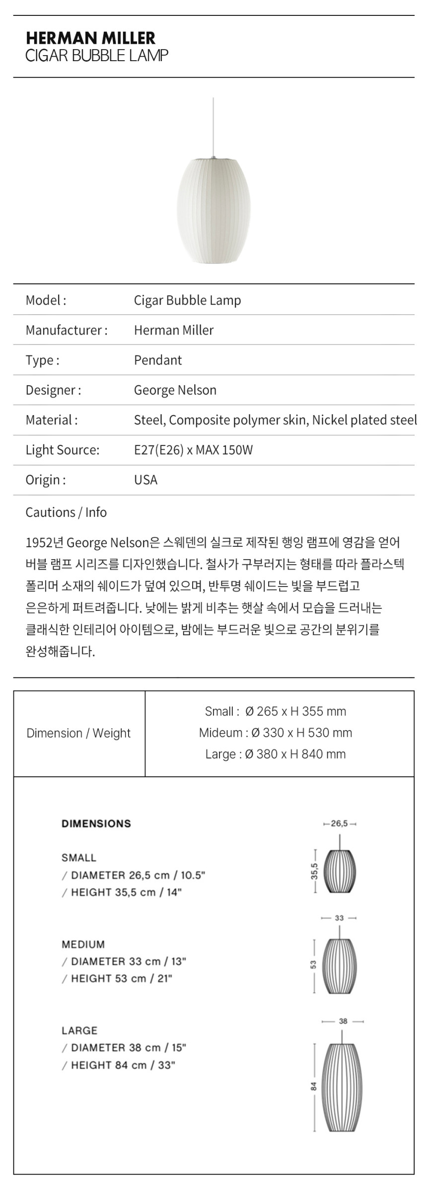 넬슨 시가 버블 펜던트는 플레이트와 1.8m 길이의 코드를 사용하여 천장에 매달면 부드럽고 고른 빛을 발산합니다. 소, 중, 대, 특대 사이즈로 출시됩니다. 이 램프는 1952년, 넬슨이 실크 커버로 정교하게 제작된 스웨덴식 행잉 램프 세트에서 영감을 받아 탄생했습니다. 하지만 더 큰 문제는 높은 가격이었습니다. 넬슨은 직접 세트를 제작하기로 결심하고, 실크 전등을 반투명 플라스틱 소재로 대체하는 혁신적인 공정을 도입하여 합리적인 가격으로 출시했습니다.