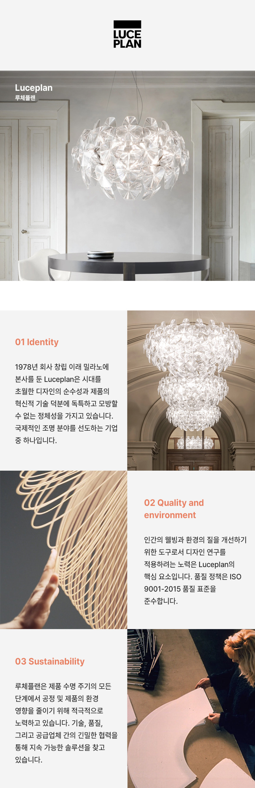 루체플랜은 1978년에 이탈리아에서 리카르도 사파티, 파올로 리자토, 산드라 세베리라는 세 명의 젊은 건축가들이 모여 설립한 조명 브랜드입니다. 아름다우면서도 고품질의 조명을 만들고자 하는 열정으로 시작된 이 브랜드는 유행을 타지 않고 오랫동안 사랑받을 수 있는 디자인과 고급스러운 마감을 추구합니다. 끝없는 연구와 혁신을 통해 국제적으로도 잘 알려진, 혁신적인 조명 솔루션을 제공하는 것으로 유명하며 단순한 조명을 넘어 공간에 품격과 아름다움을 더해주는 명품 조명 브랜드입니다.