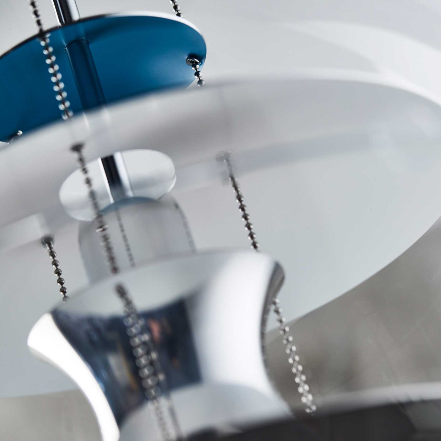 맑고 투명한 아크릴 구 안에는 다섯 개의 리플렉터가 세 개의 스틸 체인으로 섬세하게 매달려 있으며, 붉은색과 파란색의 포인트가 미래적인 아름다움을 더합니다.