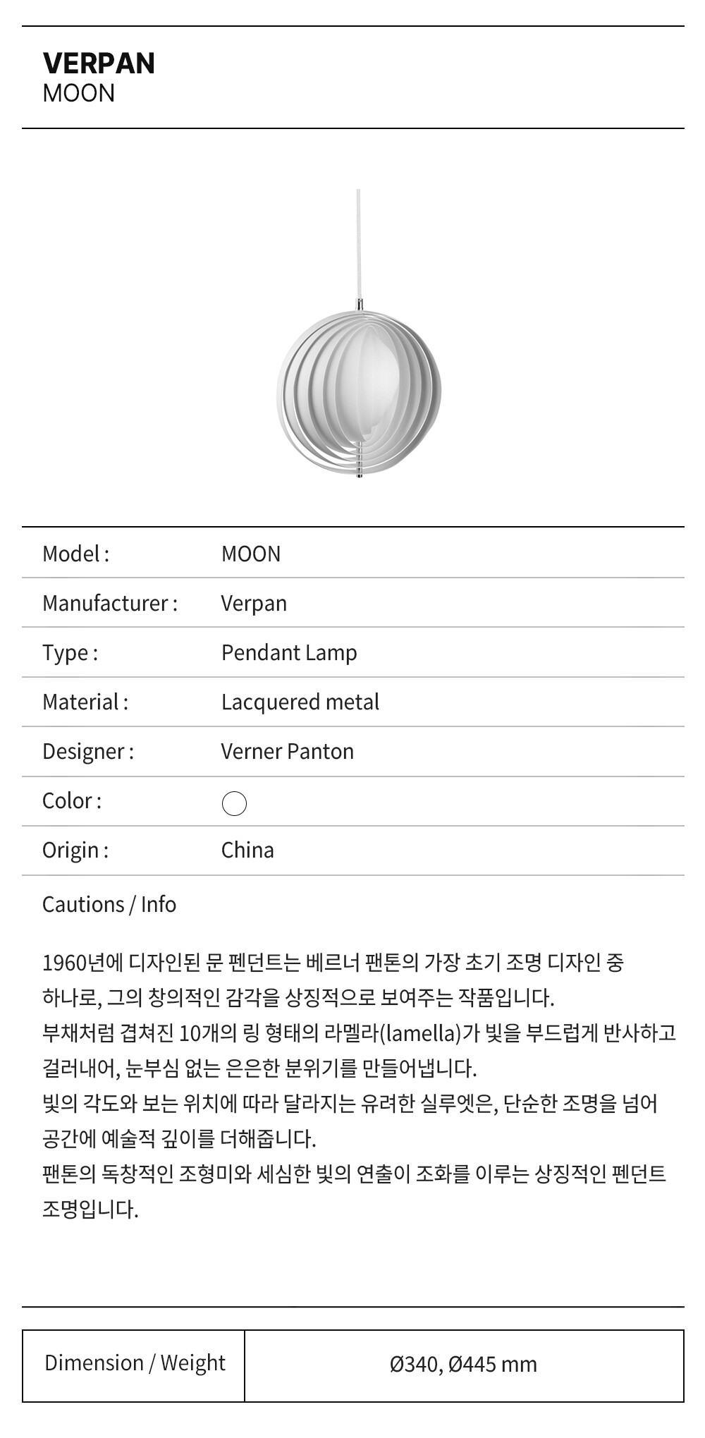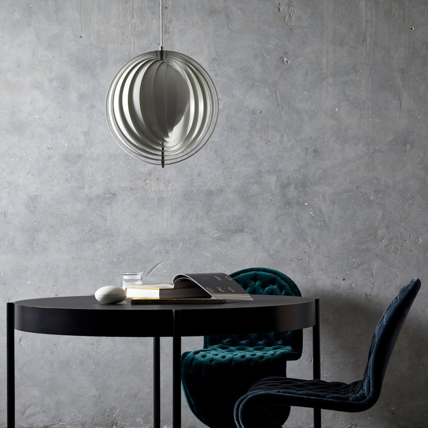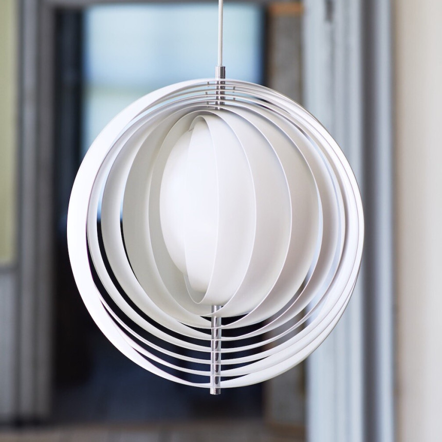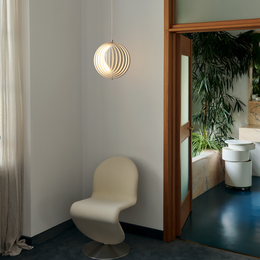 1960년에 디자인된 문 펜던트는 베르너 팬톤의 가장 초기 조명 디자인 중 하나로, 그의 창의적인 감각을 상징적으로 보여주는 작품입니다.