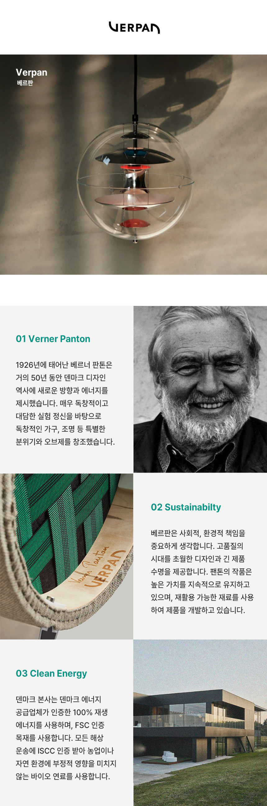 VERPAN은 덴마크의 건축가이자 디자이너인 베르너 팬톤(Verner Panton) 의 빛나는 유산을 보존하고, 재해석하며, 현대적으로 이어가는 디자인 브랜드입니다.