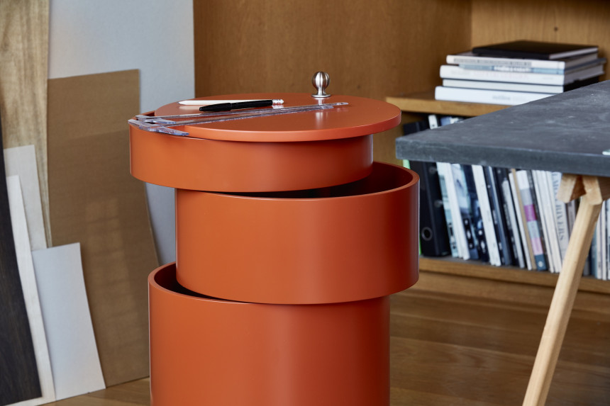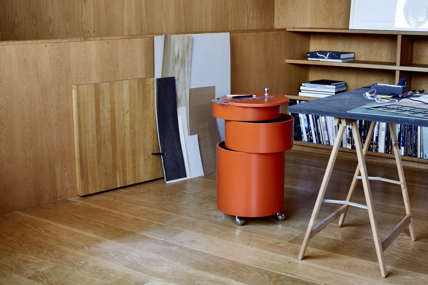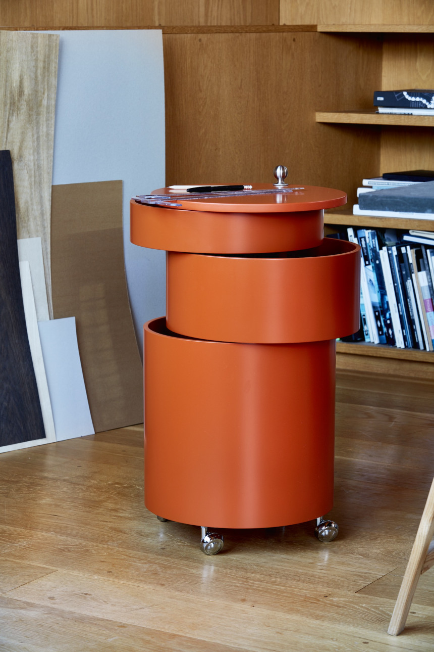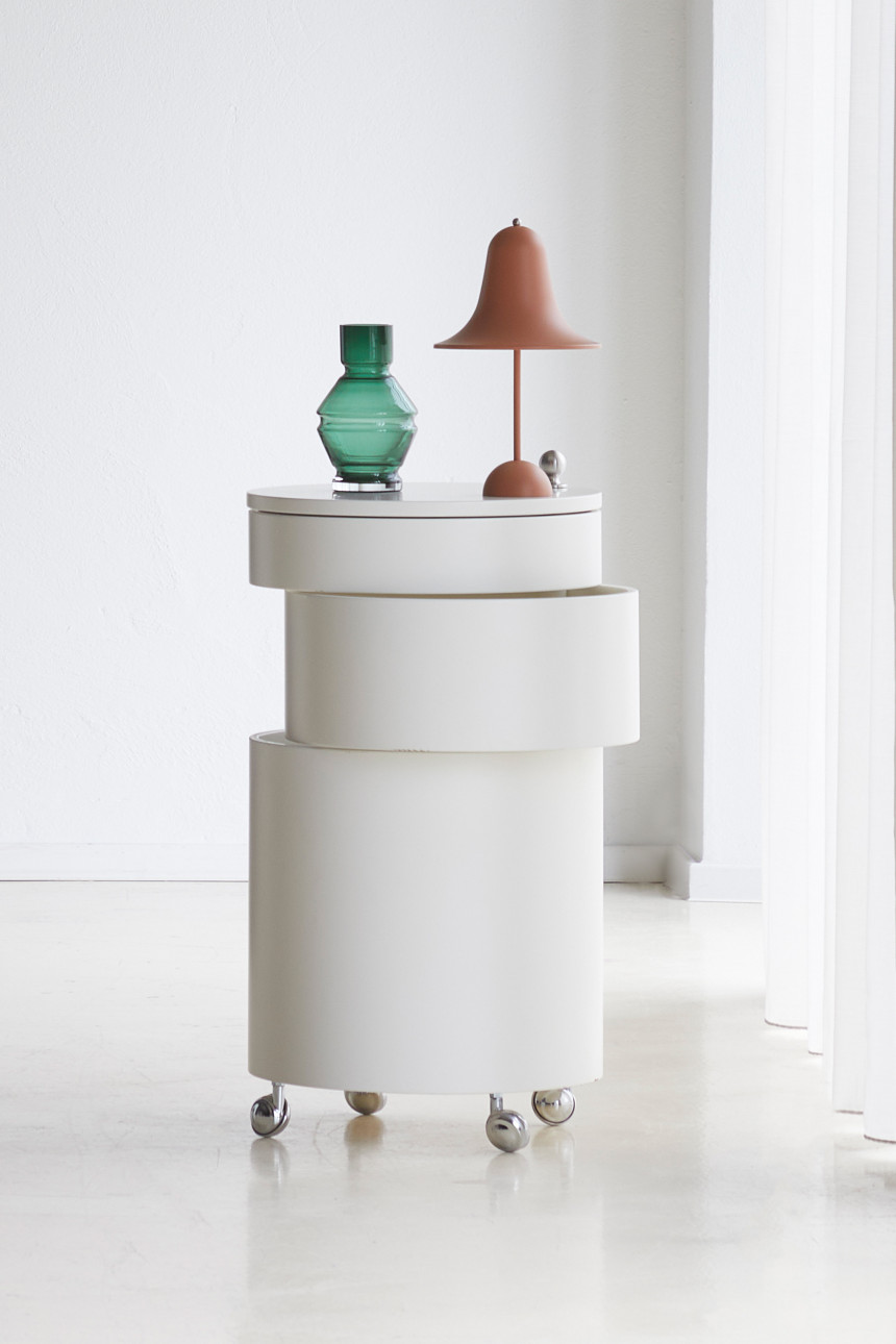 사이드 테이블과 이동식 수납 기능을 하나로 결합한 다용도 가구 Barboy는 세 개의 원형 서랍으로 구성되어 있으며,