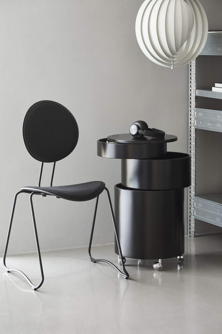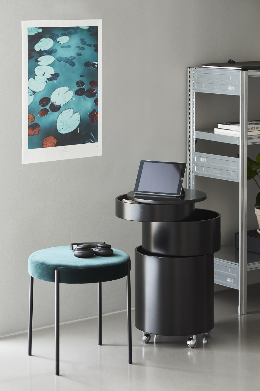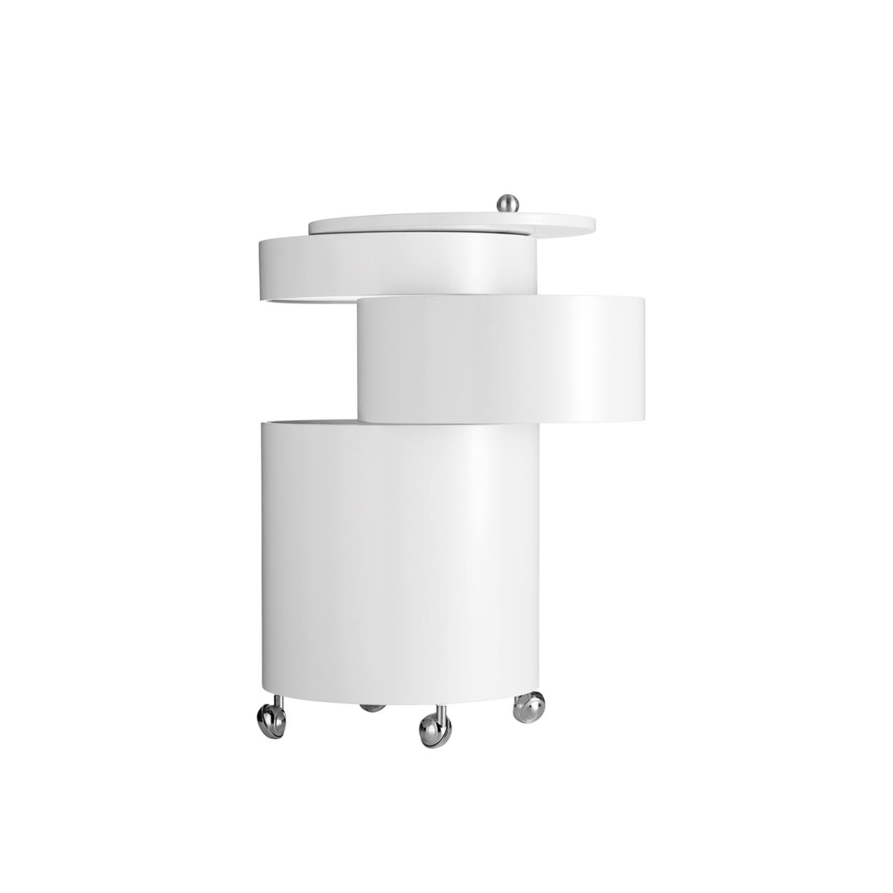 사이드 테이블과 이동식 수납 기능을 하나로 결합한 다용도 가구 Barboy는 세 개의 원형 서랍으로 구성되어 있으며,