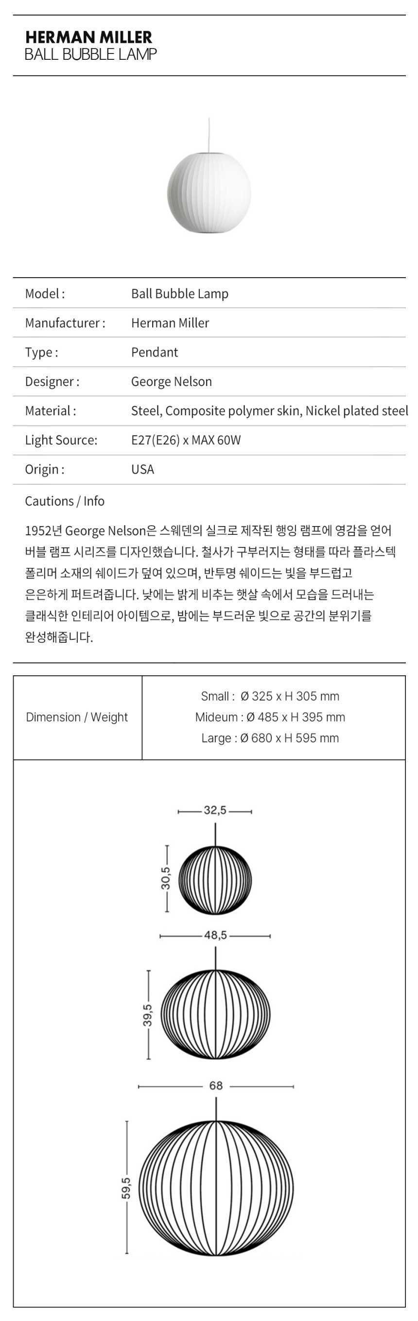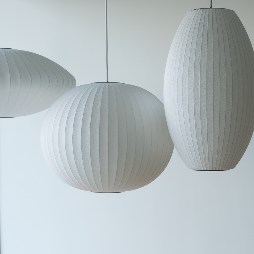 매력적인 구형 실루엣의 넬슨 버블 램프는 인테리어에 부드러움과 광채를 더합니다. 볼 버블 펜던트는 세 가지 크기로 출시되며, 완벽하게 둥근 형태는 1.8m 길이의 코드로 천장에 부착됩니다. 버블 램프는 넬슨이 스웨덴의 행잉 램프 세트에 깊은 인상을 받은 1952년에 처음 디자인되었습니다. 당시 가격이 너무 비싸서 넬슨은 직접 디자인하여 가격을 낮췄습니다. 그 결과, 원초적인 구형 모양을 가진 램프 시리즈가 탄생했습니다.