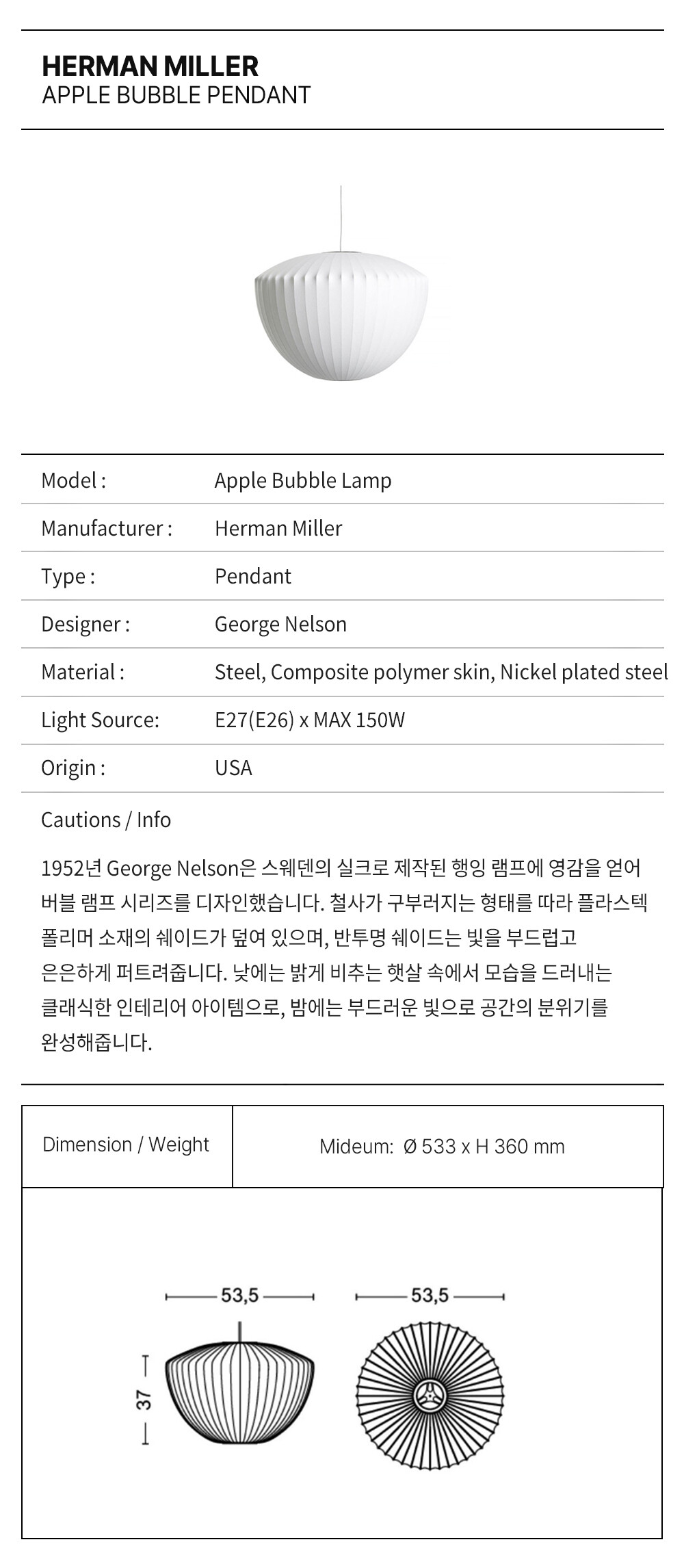 이름처럼 애플 버블 펜던트는 둥근 실루엣과 부드럽고 고른 빛으로 인테리어에 매력과 따뜻함을 더합니다. 스틸 천장판과 1.8미터 길이의 코드가 함께 제공되어 천장에 고정할 수 있습니다. 조지 넬슨은 1952년, 사무실에 놓을 스웨덴식 행잉 램프를 우연히 발견하면서 버블 램프를 처음 디자인했습니다. 비싼 가격에 고민하던 그는 직접 만들기로 결심했습니다. 그 결과, 원초적인 구형의 형태를 가진 램프 시리즈가 탄생했습니다.