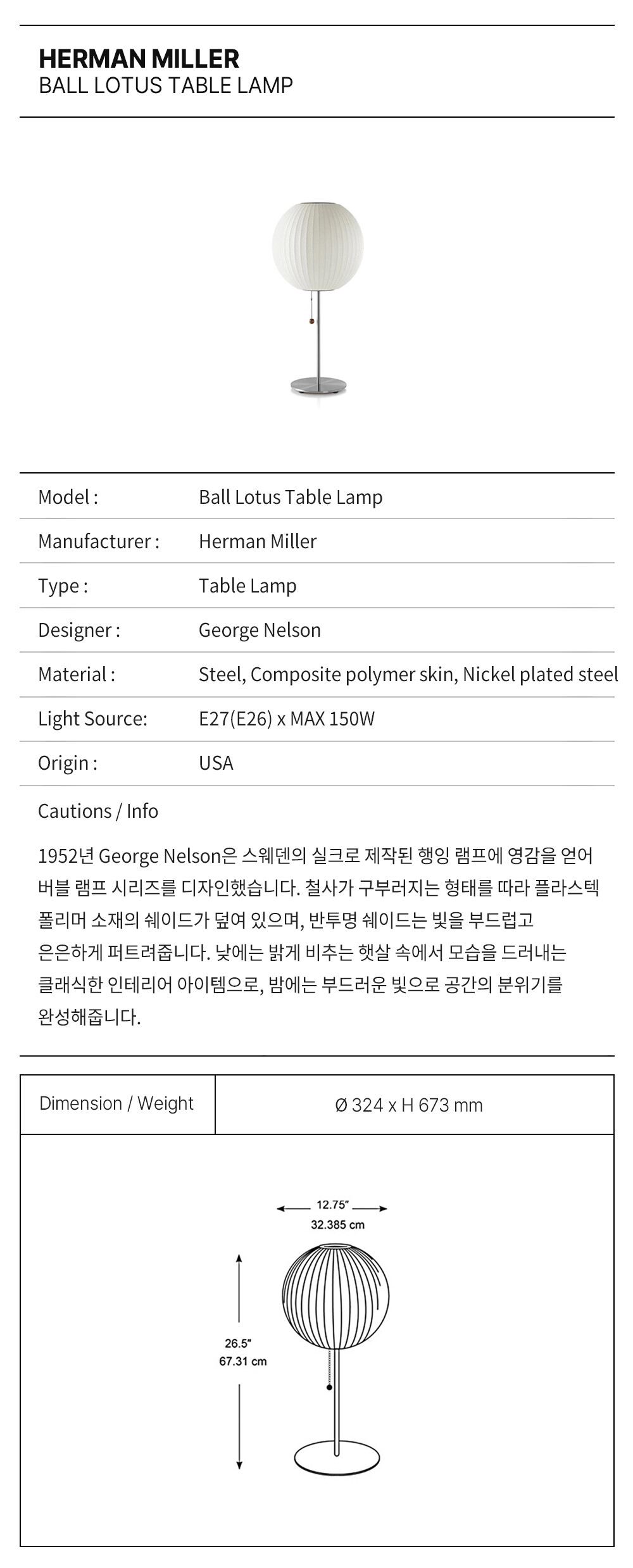 가벼운 강철 프레임으로 제작된 넬슨 볼 로터스 테이블 램프는 완벽하게 둥근 구형으로, 월넛 커버 유무에 따라 선택 가능한 강철 받침대 위에 올려져 있으며, 2185mm 플러그인 케이블이 포함되어 있습니다. 견고한 월넛 마감의 체인을 당겨 편리하게 램프를 켜고 끌 수 있습니다. 1952년, 넬슨은 실크 커버로 제작된 스웨덴식 행잉 램프 세트에 깊은 인상을 받았습니다. 당시 가격이 너무 비싸서 넬슨은 직접 램프를 디자인하여 가격을 낮췄습니다.