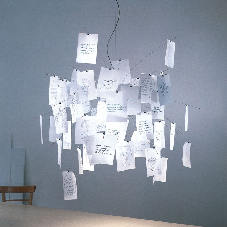 Zettel'z 5는 Ingo Maurer의 가장 유명한 램프 중 하나입니다. 사용자가 마음껏 창의력을 발휘할 수 있는 공간을 제공합니다. 얇은 막대의 위치에 따라 다양한 방식으로 설치할 수 있습니다. 함께 제공되는 빈 용지는 메시지나 스케치를 직접 그릴 수 있도록 설계되었습니다. Zettel'z 5는 A5 크기의 인쇄 용지 31장과 인쇄되지 않은 용지 49장으로 구성되어 있습니다. 일본 종이는 매우 얇고 반투명합니다.