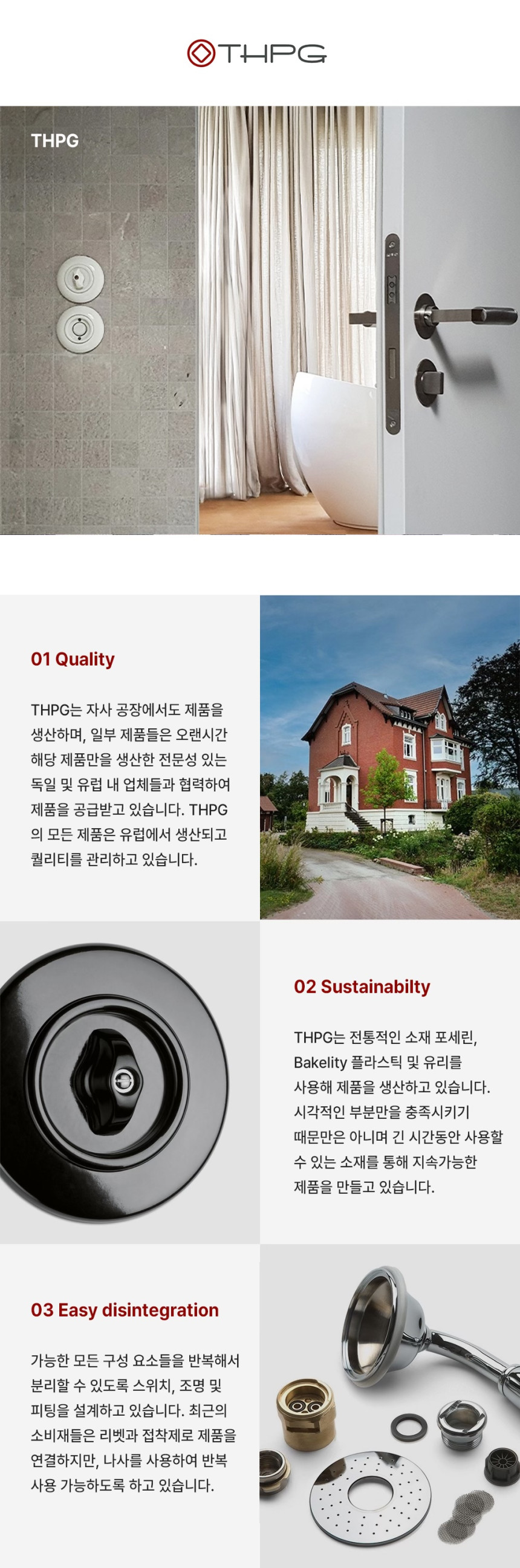 토마스 후프(Thomas Hoof)가 설립한 THPG사는 독일 뤼딩하우젠(Lüdinghausen)에 위치한 자체 작업장에서 직접 생산되며, 1998년부터 2007년까지 Manufactum 그룹의 일원으로 자체 제품 라인의 개발 및 제조를 담당하였으며, 현재는 베이클라이트(Bakelite®), 자기(Porcelain), 유리(Glass)로 제작된 스위치 및 조명 시스템의 생산 및 유통에 주력하고 있습니다. 이 제품들은 현재 유럽 전역에서 성공을 거두고 있으며 주로 역사적 기념물 보존, 오래된 건물 리모델링, 호텔, 박물관, 상업 및 공공 시설, 그리고 개인 신축 건물에 활용되고 있습니다.