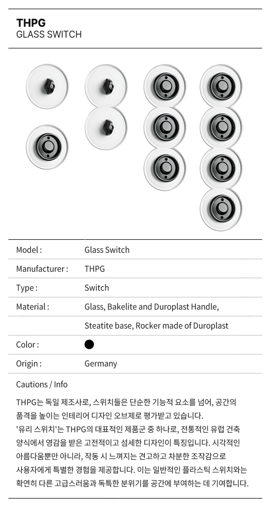 KC 안전 인증받은 제품으로 베이클라이트, 유리, 자기와 같은 견고한 전통적인 소재들을 사용하여 제품을 제작합니다. 이러한 소재들은 시각적인 아름다움뿐만 아니라, 각각의 용도에 맞는 탁월한 장점들을 제공하여 제품의 긴 수명을 보장합니다.