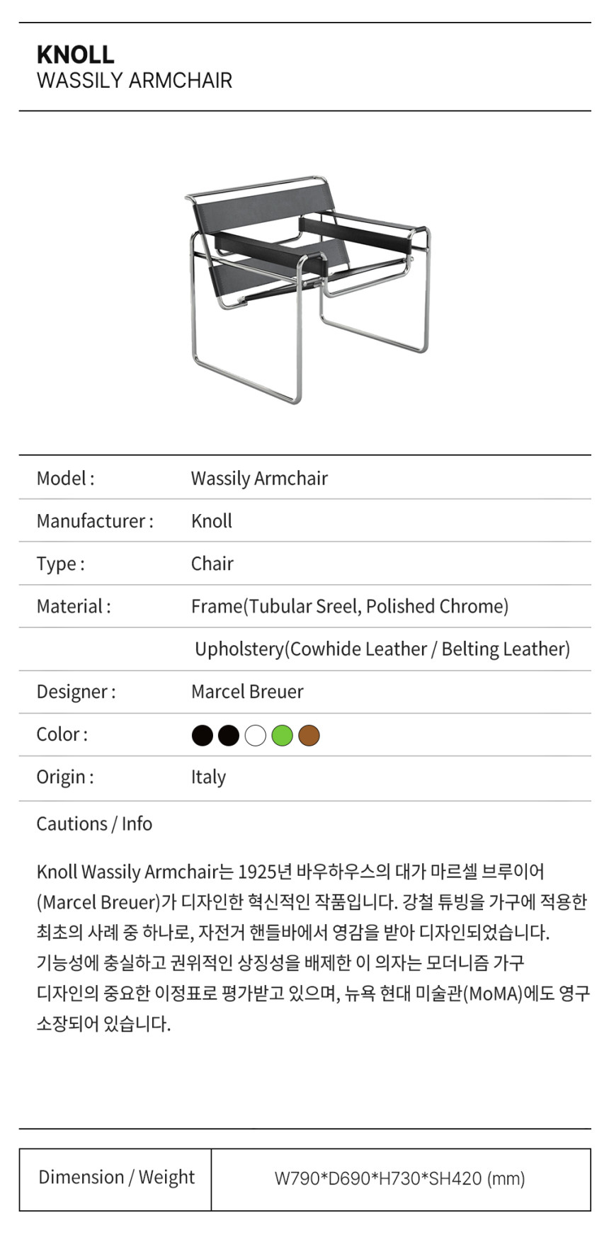 소재: 프레임(튜블러 스틸), 좌판 및 등받이(가죽 또는 코르푸 가죽)