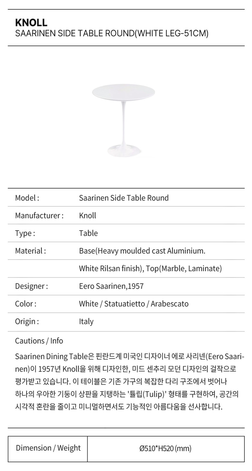 놀 사리넨 사이드 테이블-라운드 Knoll Saarinen Side Table 51cm Round(white)