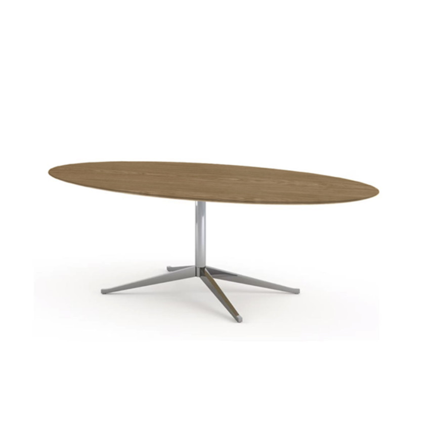 플로렌스 놀(Florence Knoll)의 이름을 딴 Florence Knoll Conference Table은 그녀의 "채워 넣는 조각(fill-in pieces)"이라는 디자인 철학을 반영하며, 간결하면서도 견고한 구조로 현대적인 컨퍼런스 공간의 기준을 제시합니다. 이 테이블은 튜블러 스틸 다리와 베벨 처리된 종방향 베니어 상판이 특징이며, 이는 아름다움을 더하는 요소입니다. 이 제품은 단순한 디자인을 넘어 시대와 공간을 초월하는 가치를 지니고 있습니다.