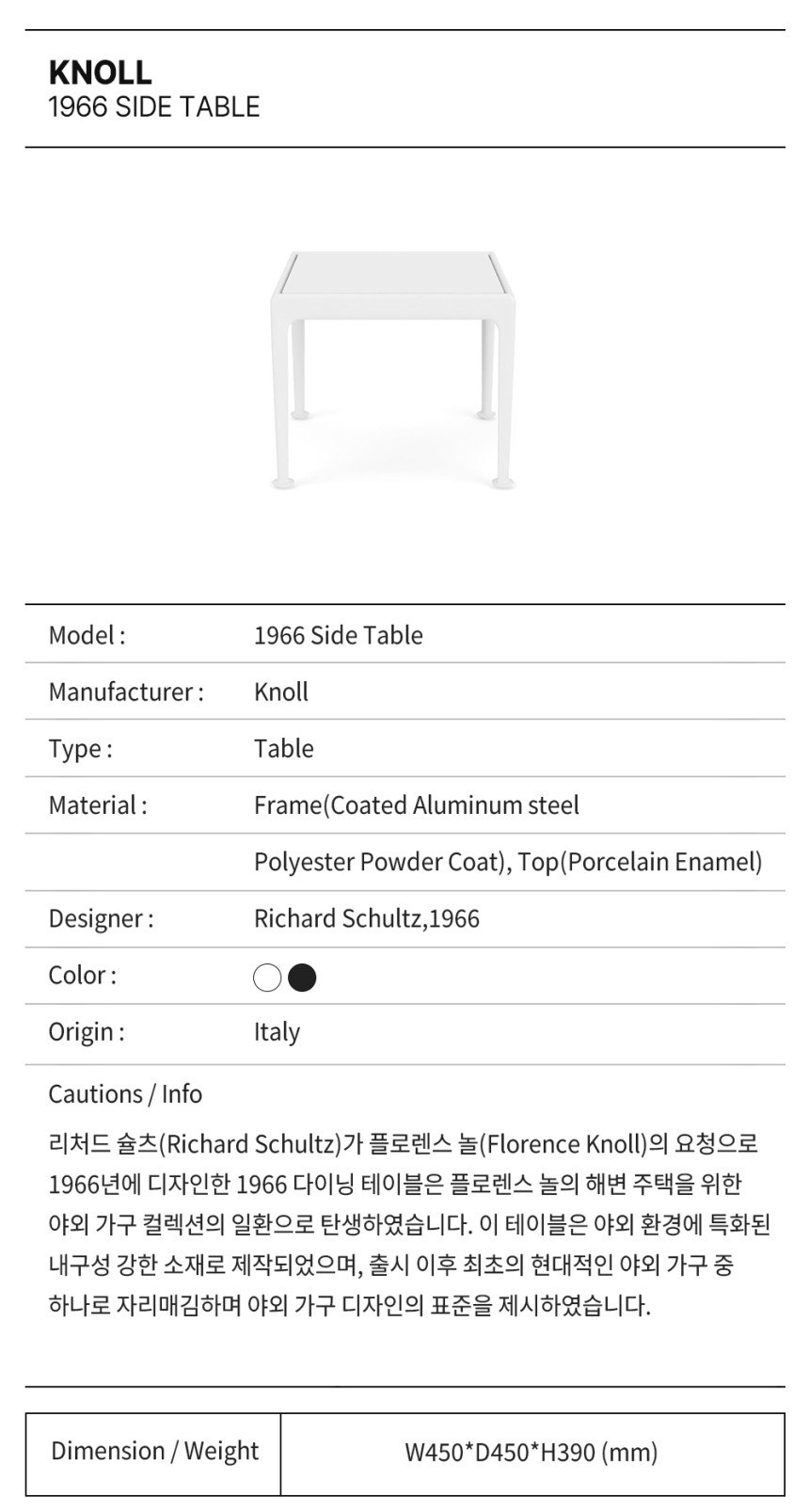 리처드 슐츠(Richard Schultz)가 디자인한 1966 End Table은 최초의 모던 아웃도어 가구 컬렉션인 '1966 컬렉션'의 일부입니다. 이 컬렉션은 야외 가구의 표준이 되었으며, End Table 또한 이 기준을 따릅니다. 야외 환경을 위해 설계되었으며, 내후성 폴리에스터 파우더 코팅 마감된 알루미늄 프레임과 흰색 유리섬유 상판이 특징입니다. 용접된 주물 및 압출 알루미늄 구조와 스테인리스 스틸 부품으로 견고함을 더했습니다.