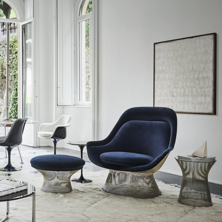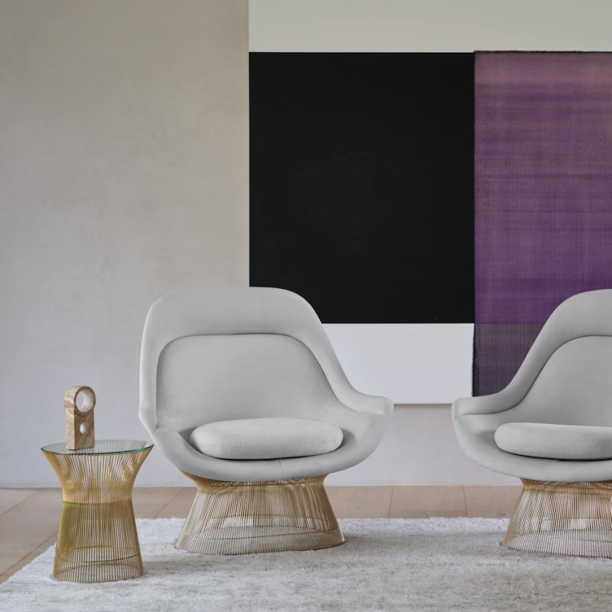 놀(Knoll)사의 플래트너 이지 체어(Platner Easy Chair)는 디자이너 워렌 플래트너(Warren Platner)에 의해 1966년에 처음 선보인 상징적인 라운지 체어입니다. 수백 개의 구부러진 금속 막대를 원형 프레임에 용접하여 만들어진 독특하고 아름다운 형태로 유명하며, 이는 가구 애호가들을 사로잡는 고유한 디자인 요소입니다. 수작업으로 제작된 이 이지 체어는 매혹적인 편안함의 정수를 보여주며, 오토만과 함께 또는 단독으로 사용할 수 있습니다.