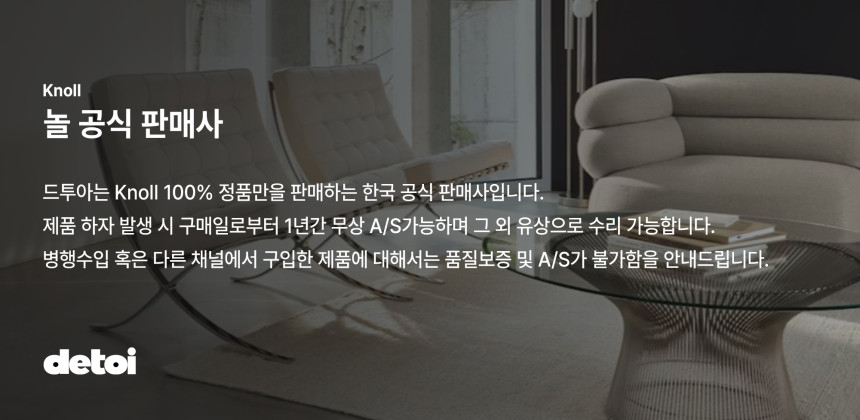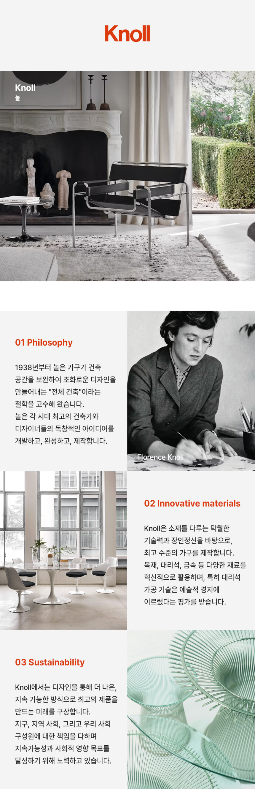 Knoll의 MR Armchair는 1927년 루트비히 미스 판 데어 로에가 디자인한 모더니즘 가구의 선구적인 작품입니다. 19세기 흔들의자에서 영감을 받은 현대적인 형태로 평가되며, 강철 튜빙을 가구 디자인에 최초로 적용한 사례 중 하나로 기록됩니다. 본 의자는 캔틸레버 방식으로 설계된 좌석이 앉는 이의 움직임에 따라 부드럽게 움직여 편안함을 제공하며, 이음새 없는 튜블러 스틸 프레임으로 제작되어 미학적 우수성과 내구성을 동시에 갖추고 있습니다.