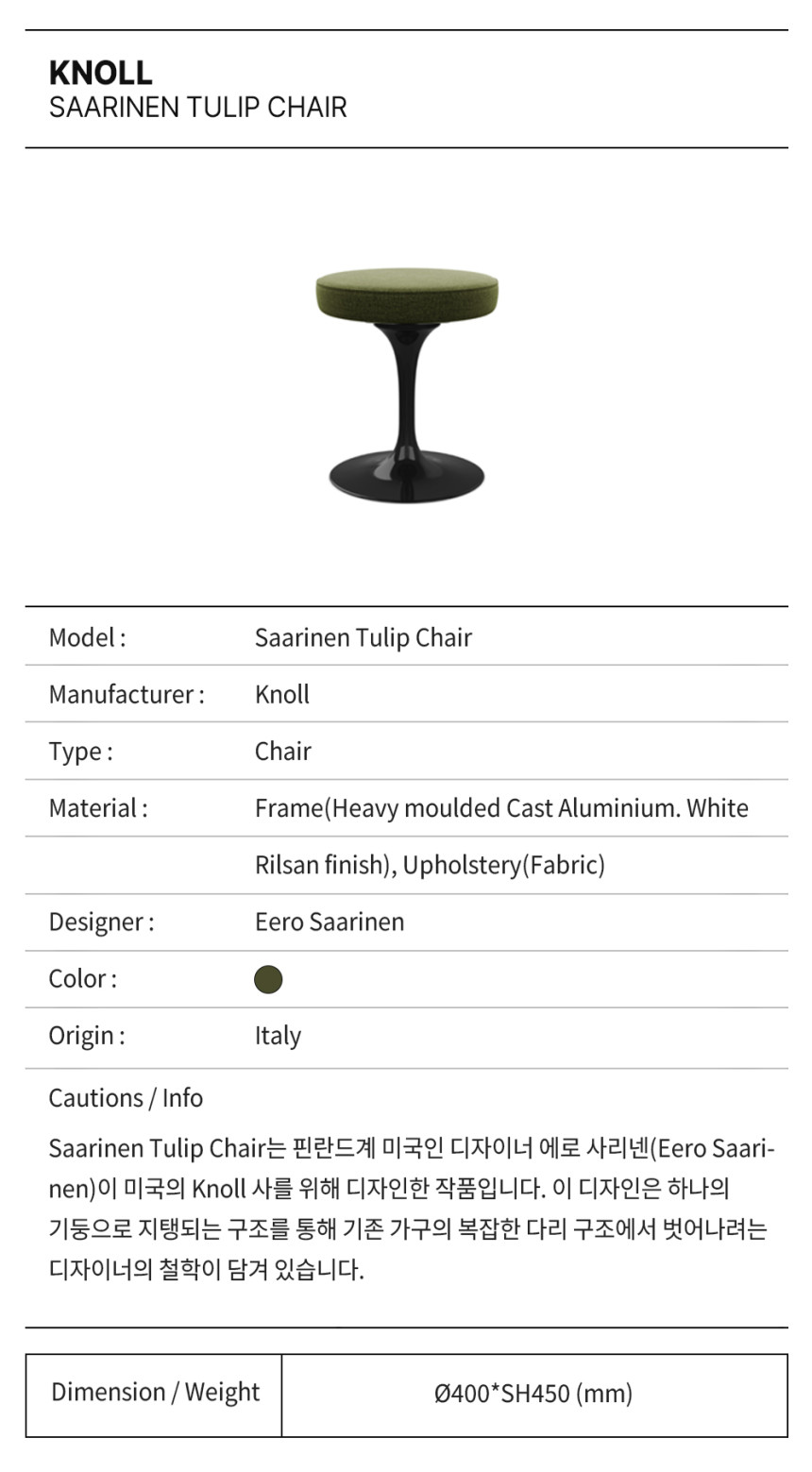 Saarinen Tulip Chair는 핀란드계 미국인 디자이너 에로 사리넨(Eero Saarinen)이 미국의 Knoll 사를 위해 디자인한 작품입니다. 이 디자인은 하나의 기둥으로 지탱되는 구조를 통해 기존 가구의 복잡한 다리 구조에서 벗어나려는 디자이너의 철학이 담겨 있습니다.
