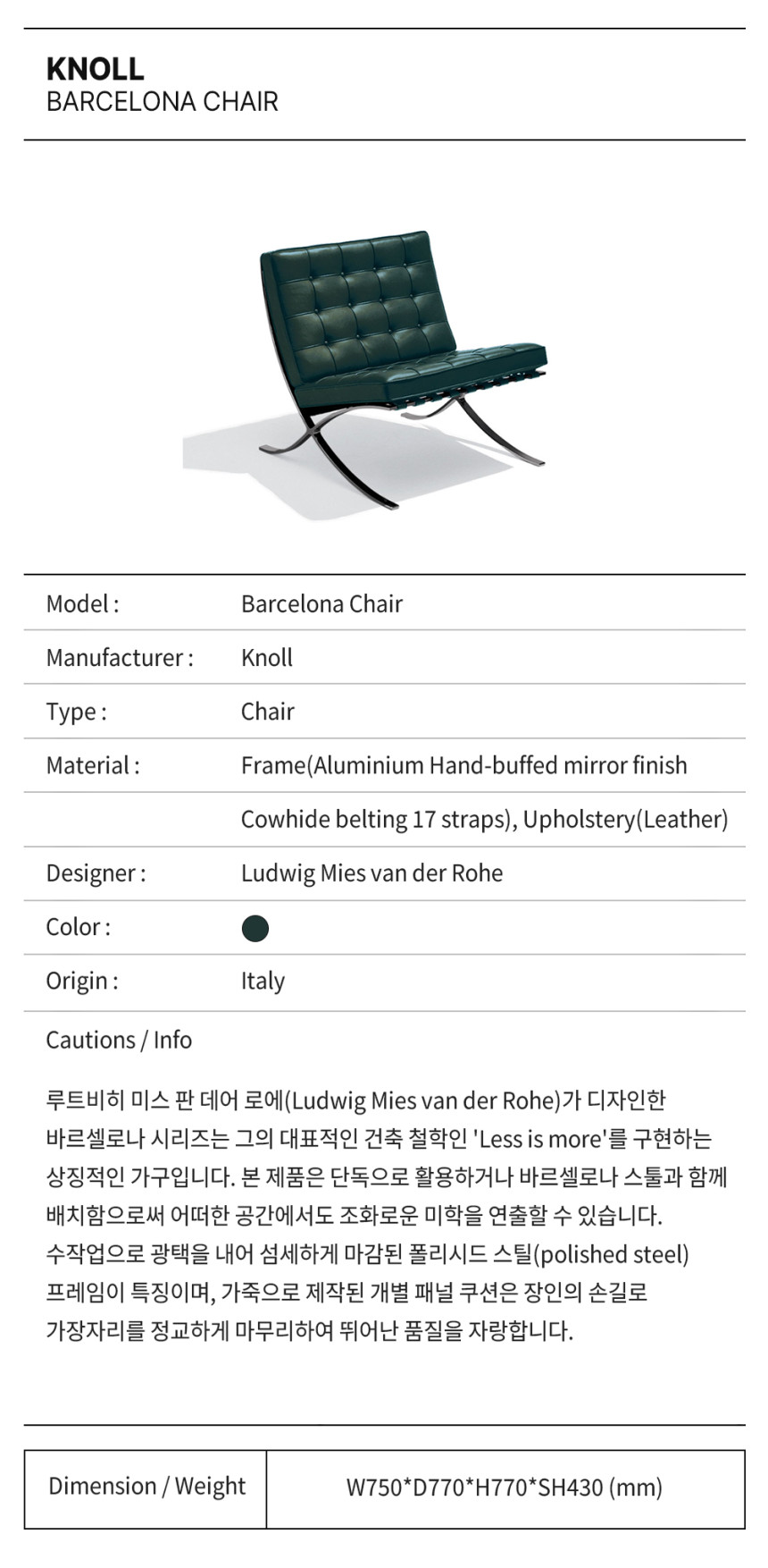놀 바르셀로나 체어 / Knoll Barcelona Chair(Bauhaus Green)