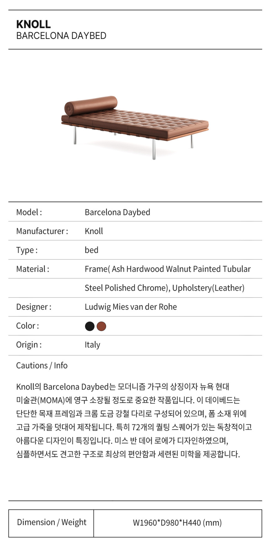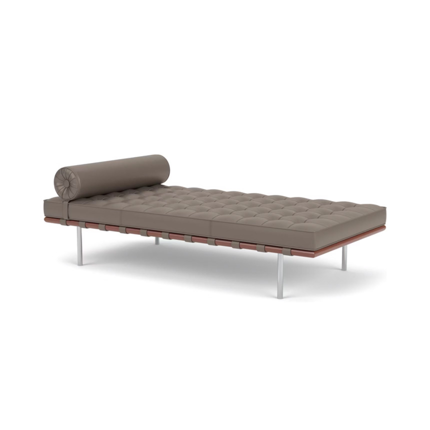 Knoll의 Barcelona Daybed는 모더니즘 가구의 상징이자 뉴욕 현대 미술관(MOMA)에 영구 소장될 정도로 중요한 작품입니다. 이 데이베드는 단단한 목재 프레임과 크롬 도금 강철 다리로 구성되어 있으며, 폼 소재 위에 고급 가죽을 덧대어 제작됩니다. 특히 72개의 퀄팅 스퀘어가 있는 독창적이고 아름다운 디자인이 특징입니다. 미스 반 데어 로에가 디자인하였으며, 심플하면서도 견고한 구조로 최상의 편안함과 세련된 미학을 제공합니다.