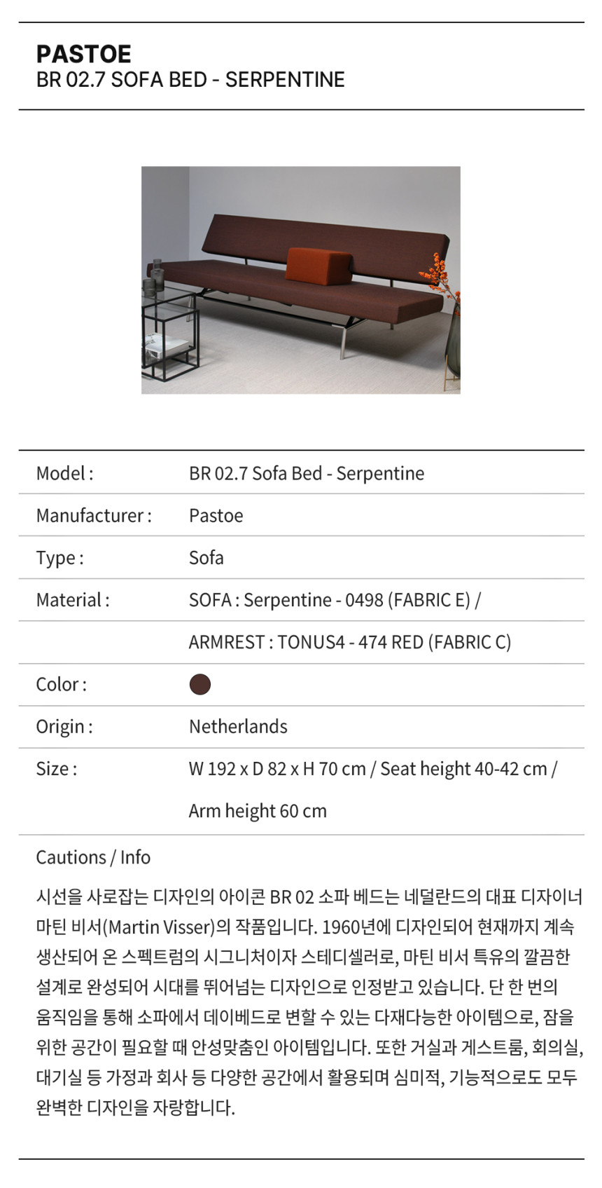 시선을 사로잡는 디자인의 아이콘 BR 02 소파 베드는 네덜란드의 대표 디자이너 마틴 비서(Martin Visser)의 작품입니다. 1960년에 디자인되어 현재까지 계속 생산되어 온 스펙트럼의 시그니처이자 스테디셀러로, 마틴 비서 특유의 깔끔한 설계로 완성되어 시대를 뛰어넘는 디자인으로 인정받고 있습니다. 단 한 번의 움직임을 통해 소파에서 데이베드로 변할 수 있는 다재다능한 아이템으로, 잠을 위한 공간이 필요할 때 안성맞춤인 아이템입니다. 또한 거실과 게스트룸, 회의실, 대기실 등 가정과 회사 등 다양한 공간에서 활용되며 심미적, 기능적으로도 모두 완벽한 디자인을 자랑합니다.