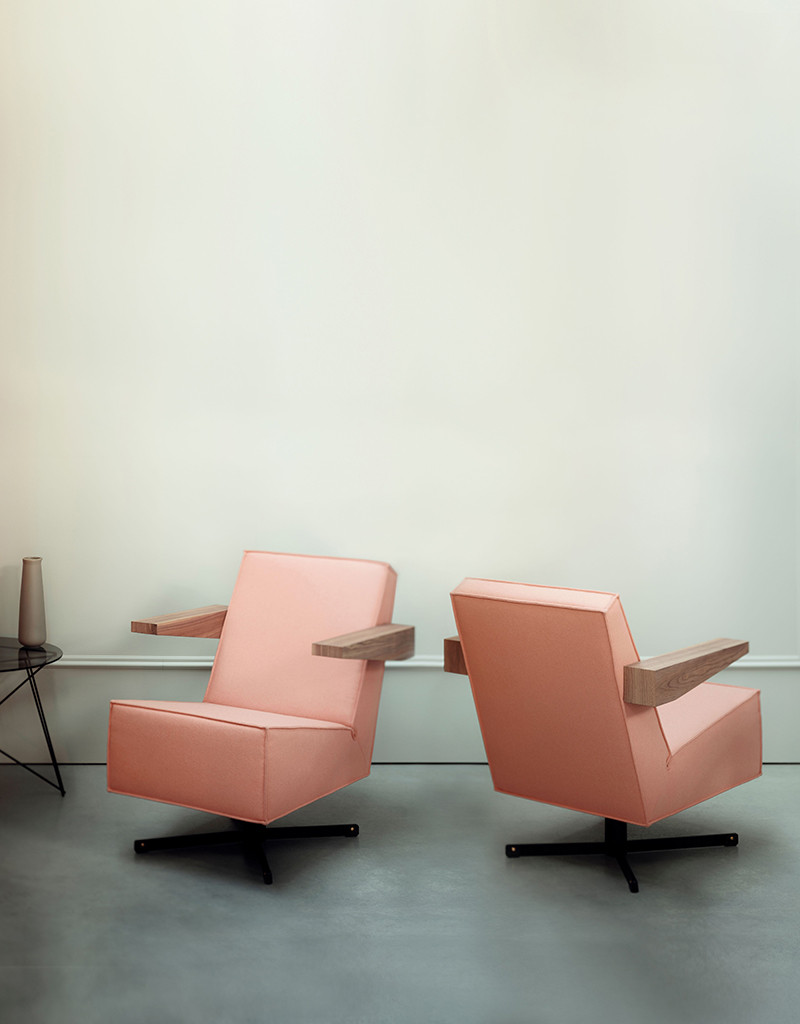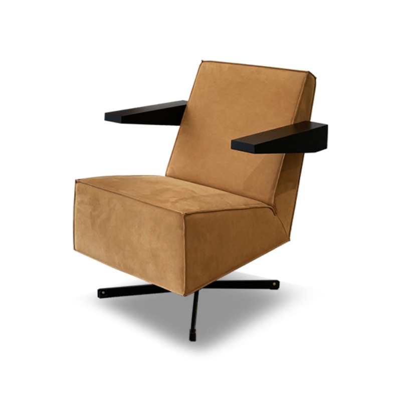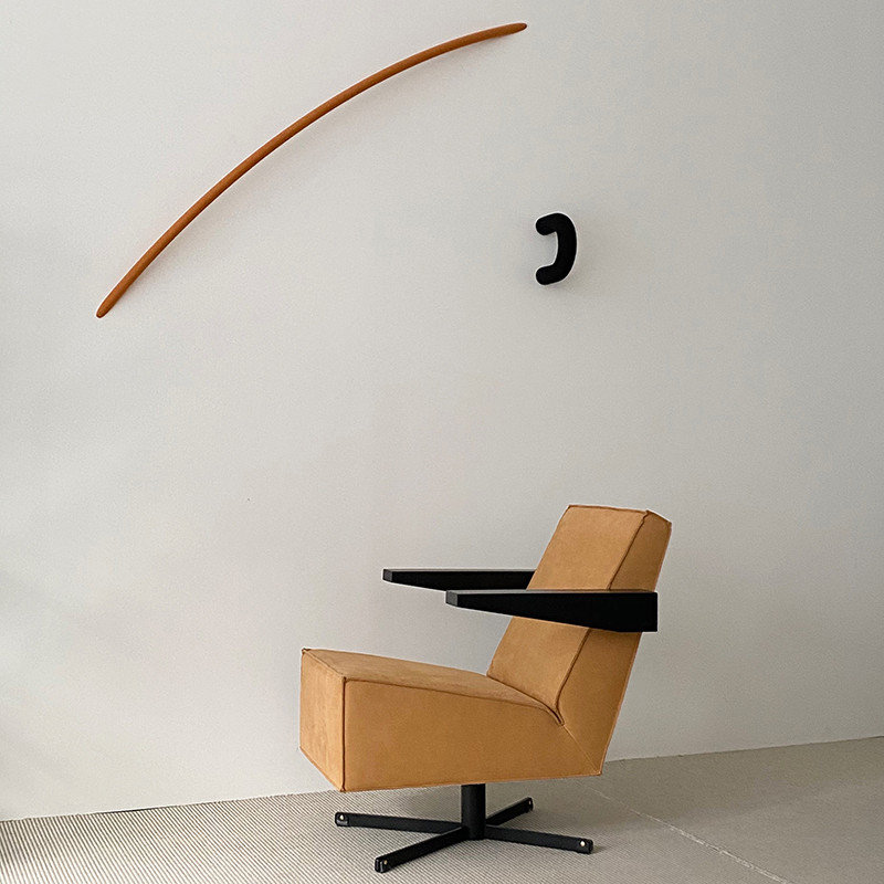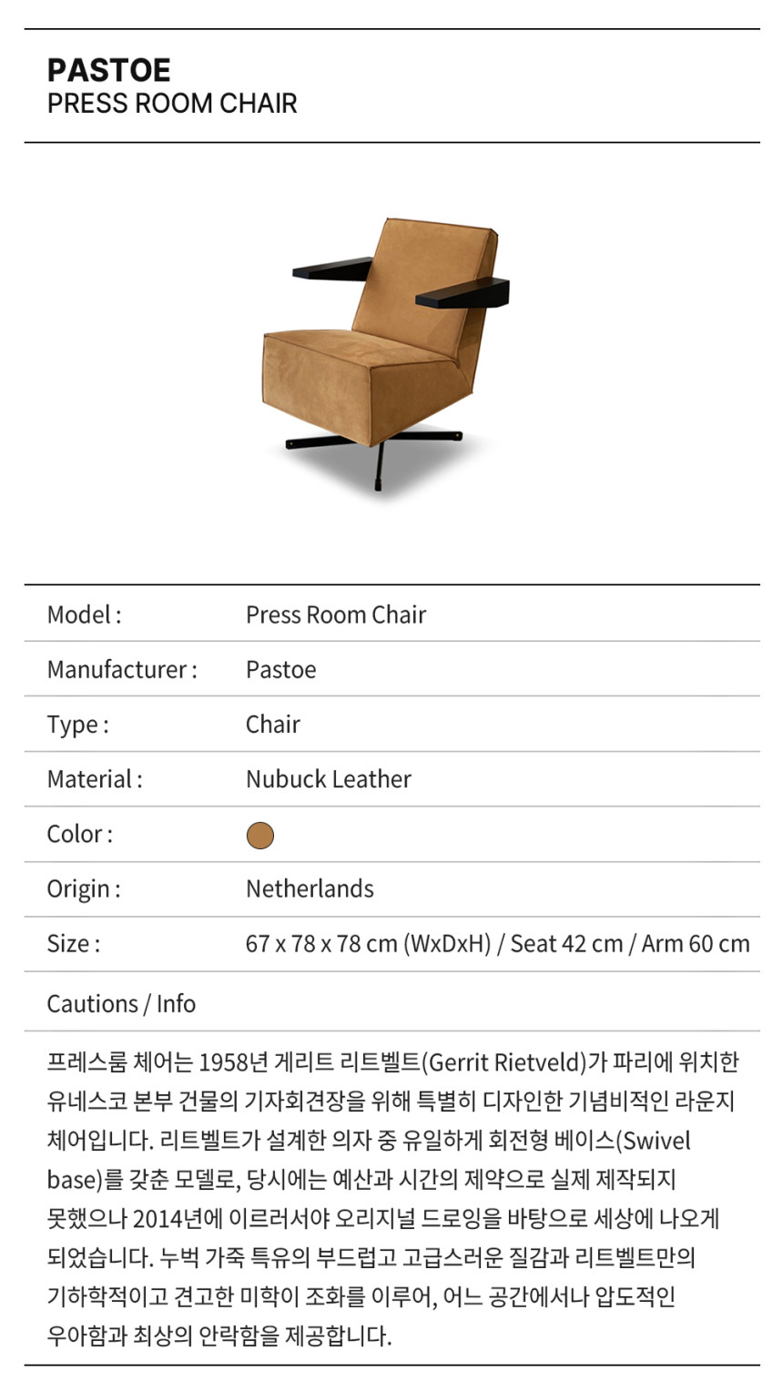 프레스룸 체어는 1958년 게리트 리트벨트(Gerrit Rietveld)가 파리에 위치한 유네스코 본부 건물의 기자회견장을 위해 특별히 디자인한 기념비적인 라운지 체어입니다. 리트벨트가 설계한 의자 중 유일하게 회전형 베이스(Swivel base)를 갖춘 모델로, 당시에는 예산과 시간의 제약으로 실제 제작되지 못했으나 2014년에 이르러서야 오리지널 드로잉을 바탕으로 세상에 나오게 되었습니다. 누벅 가죽 특유의 부드럽고 고급스러운 질감과 리트벨트만의 기하학적이고 견고한 미학이 조화를 이루어, 어느 공간에서나 압도적인 우아함과 최상의 안락함을 제공합니다.