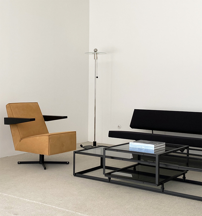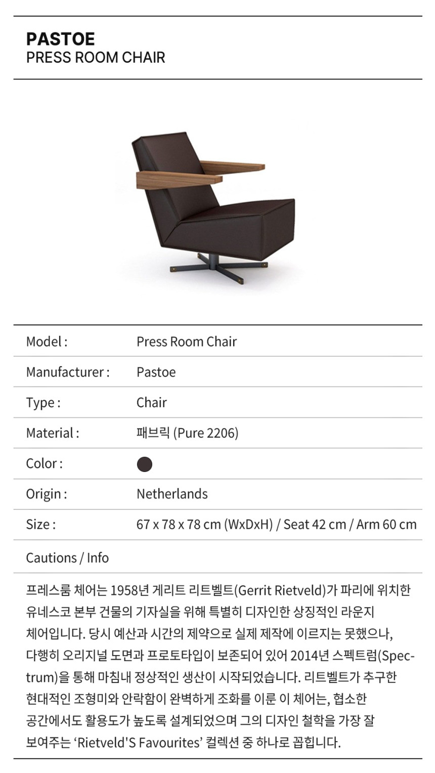 프레스룸 체어는 1958년 게리트 리트벨트(Gerrit Rietveld)가 파리에 위치한 유네스코 본부 건물의 기자실을 위해 특별히 디자인한 상징적인 라운지 체어입니다. 당시 예산과 시간의 제약으로 실제 제작에 이르지는 못했으나, 다행히 오리지널 도면과 프로토타입이 보존되어 있어 2014년 스펙트럼(Spectrum)을 통해 마침내 정상적인 생산이 시작되었습니다. 리트벨트가 추구한 현대적인 조형미와 안락함이 완벽하게 조화를 이룬 이 체어는, 협소한 공간에서도 활용도가 높도록 설계되었으며 그의 디자인 철학을 가장 잘 보여주는 ‘Rietveld'S Favourites’ 컬렉션 중 하나로 꼽힙니다.