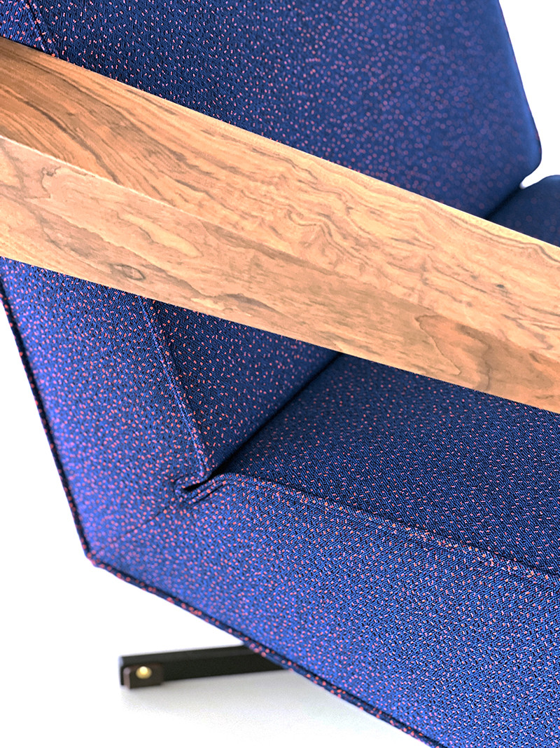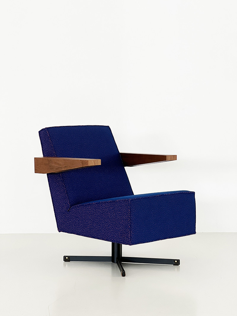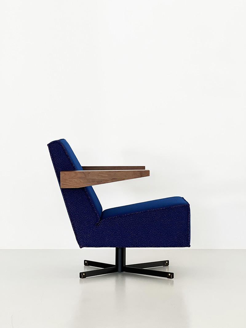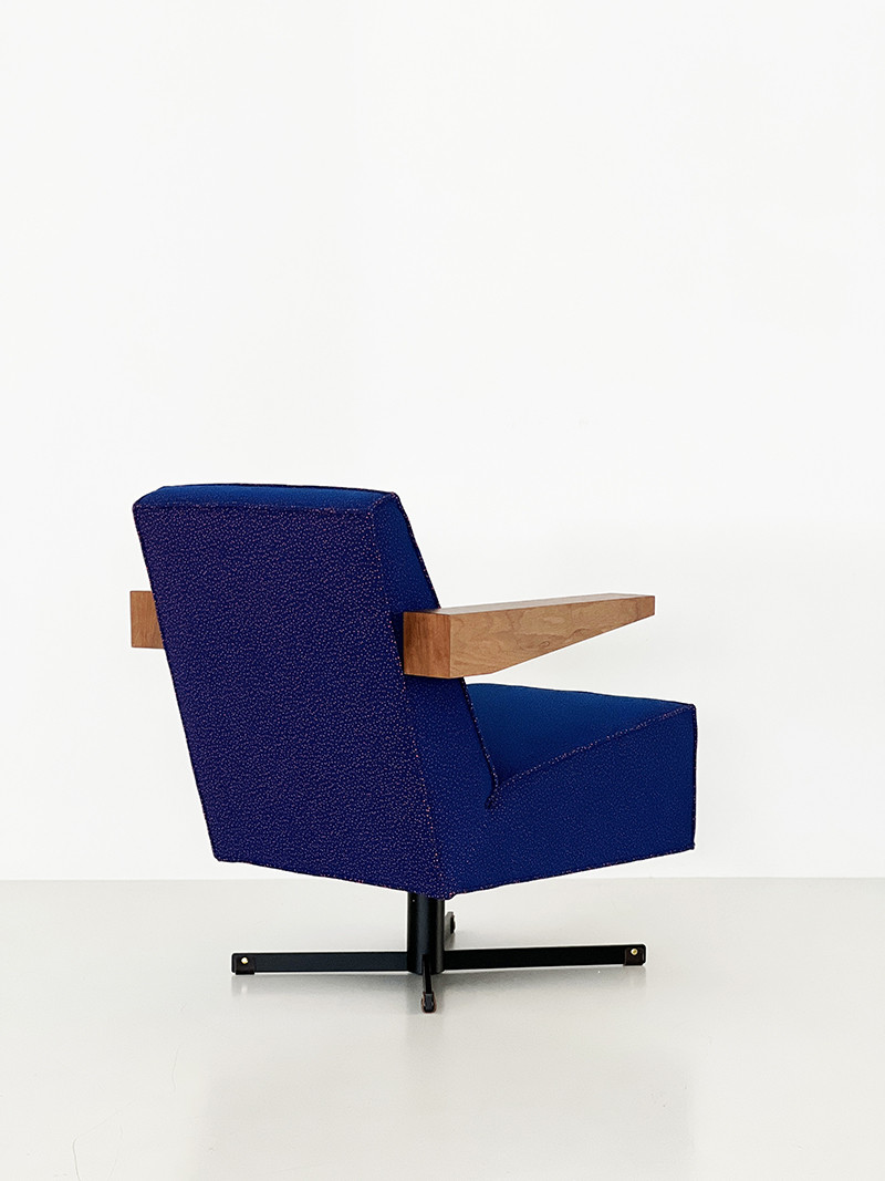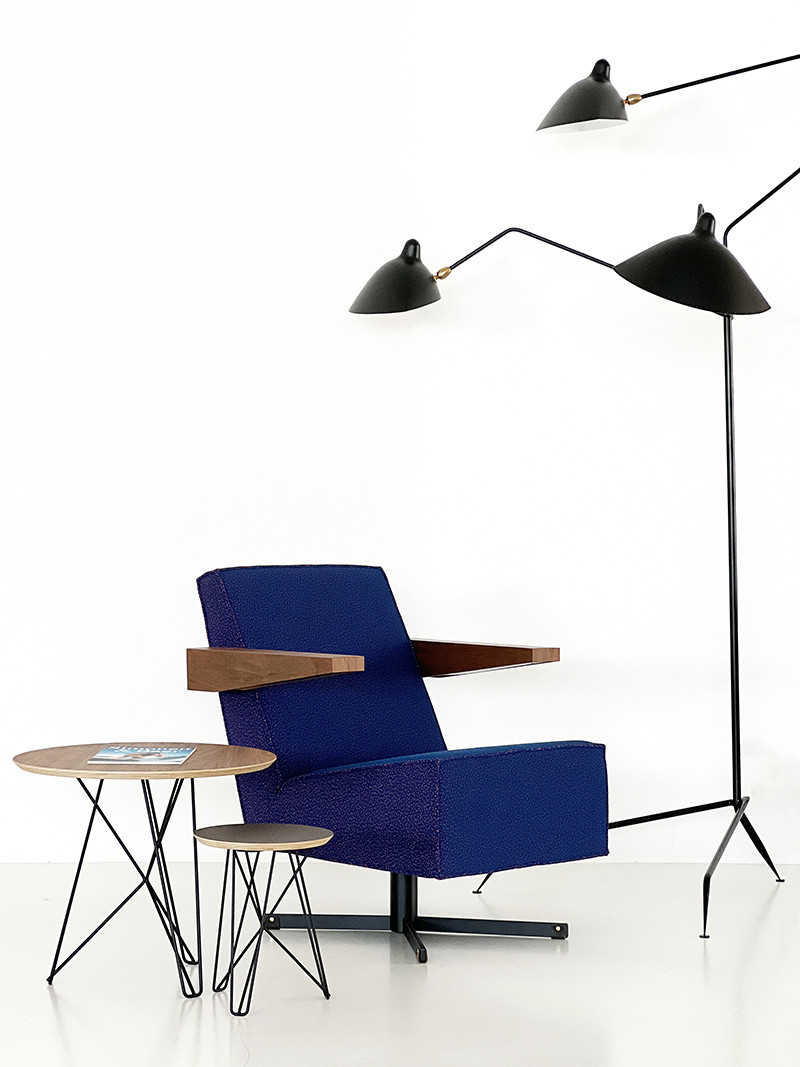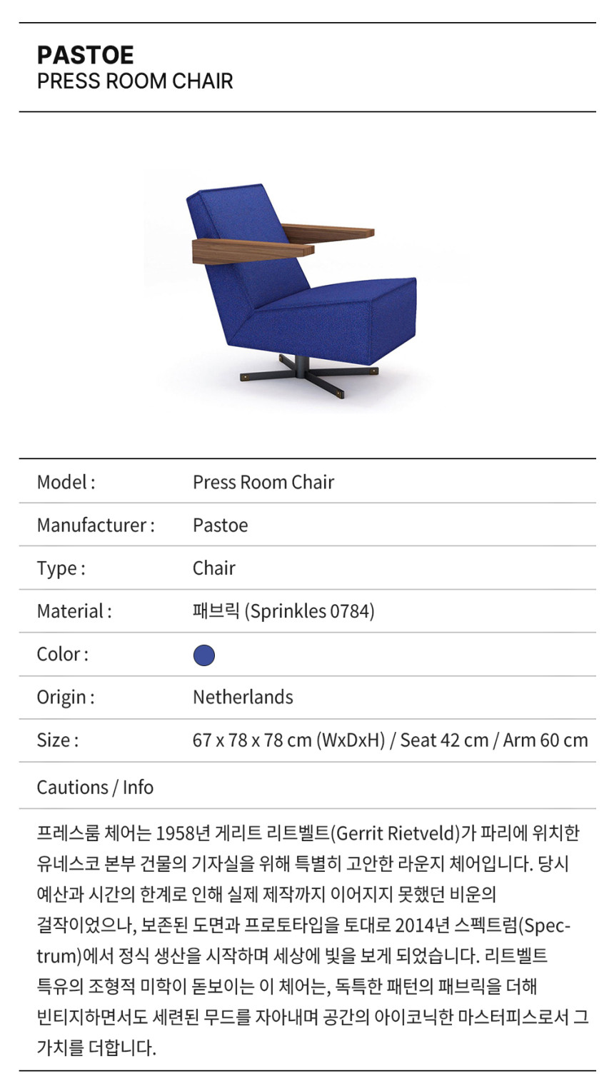 프레스룸 체어는 1958년 게리트 리트벨트(Gerrit Rietveld)가 파리에 위치한 유네스코 본부 건물의 기자실을 위해 특별히 고안한 라운지 체어입니다. 당시 예산과 시간의 한계로 인해 실제 제작까지 이어지지 못했던 비운의 걸작이었으나, 보존된 도면과 프로토타입을 토대로 2014년 스펙트럼(Spectrum)에서 정식 생산을 시작하며 세상에 빛을 보게 되었습니다. 리트벨트 특유의 조형적 미학이 돋보이는 이 체어는, 독특한 패턴의 패브릭을 더해 빈티지하면서도 세련된 무드를 자아내며 공간의 아이코닉한 마스터피스로서 그 가치를 더합니다.