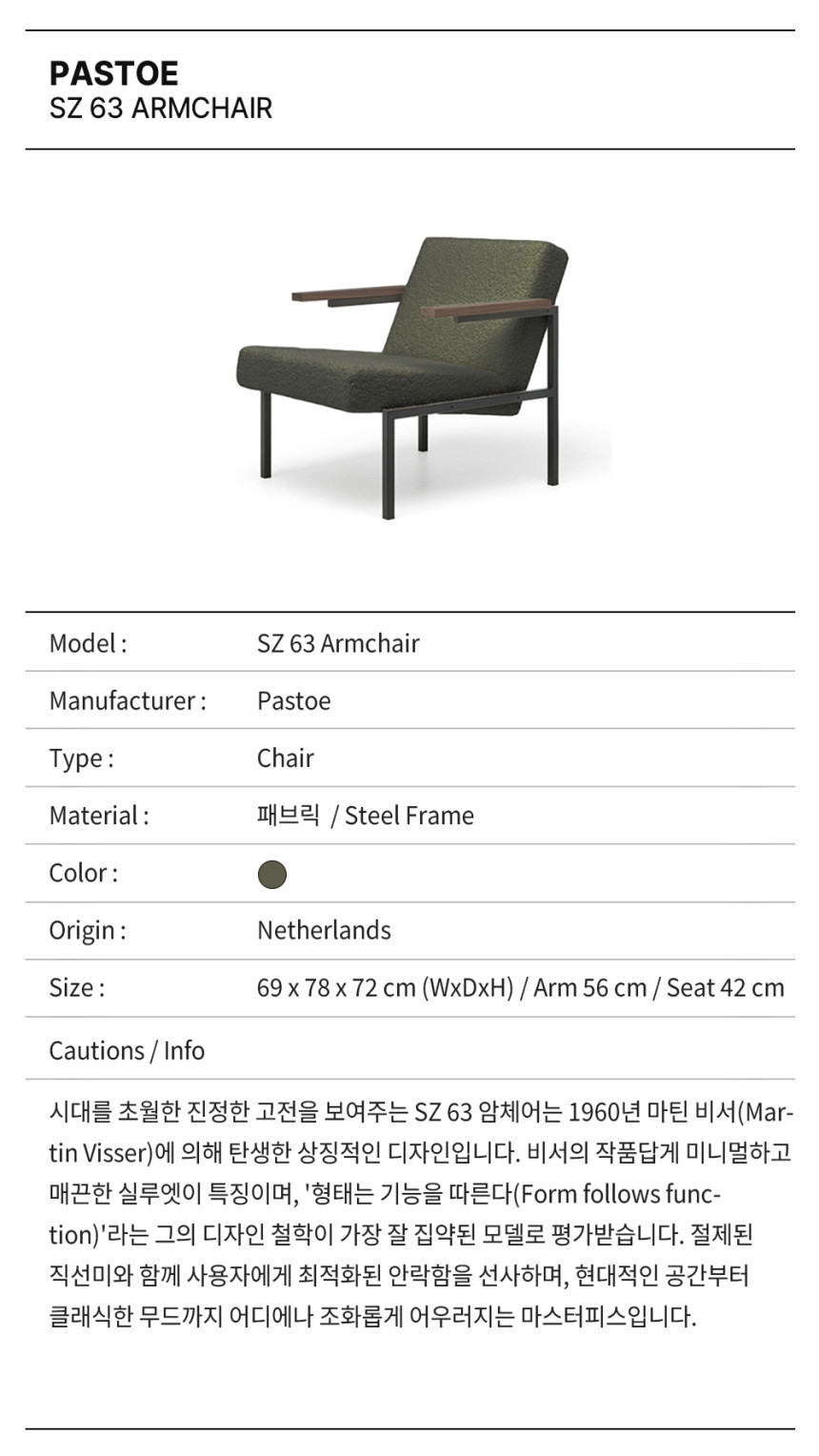 시대를 초월한 진정한 고전을 보여주는 SZ 63 암체어는 1960년 마틴 비서(Martin Visser)에 의해 탄생한 상징적인 디자인입니다. 비서의 작품답게 미니멀하고 매끈한 실루엣이 특징이며, '형태는 기능을 따른다(Form follows function)'라는 디자인 철학이 완벽하게 집약된 모델로 평가받습니다. 절제된 직선미와 함께 사용자에게 최적화된 안락함을 선사하며, 깊이감 있는 다크 그린 톤의 패브릭 마감은 공간에 차분하면서도 고급스러운 포인트가 되어줍니다.