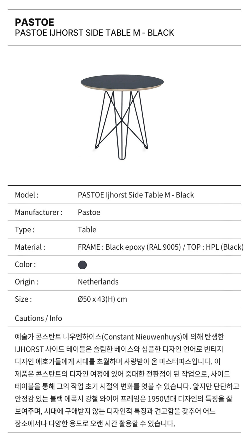 예술가 콘스탄트 니우엔하이스(Constant Nieuwenhuys)에 의해 탄생한 IJHORST 사이드 테이블은 슬림한 베이스와 심플한 디자인 언어로 빈티지 디자인 애호가들에게 시대를 초월하며 사랑받아 온 마스터피스입니다. 이 제품은 콘스탄트의 디자인 여정에 있어 중대한 전환점이 된 작업으로, 사이드 테이블을 통해 그의 작업 초기 시절의 변화를 엿볼 수 있습니다. 얇지만 단단하고 안정감 있는 블랙 에폭시 강철 와이어 프레임은 1950년대 디자인의 특징을 잘 보여주며, 시대에 구애받지 않는 디자인적 특징과 견고함을 갖추어 어느 장소에서나 다양한 용도로 오랜 시간 활용할 수 있습니다.
