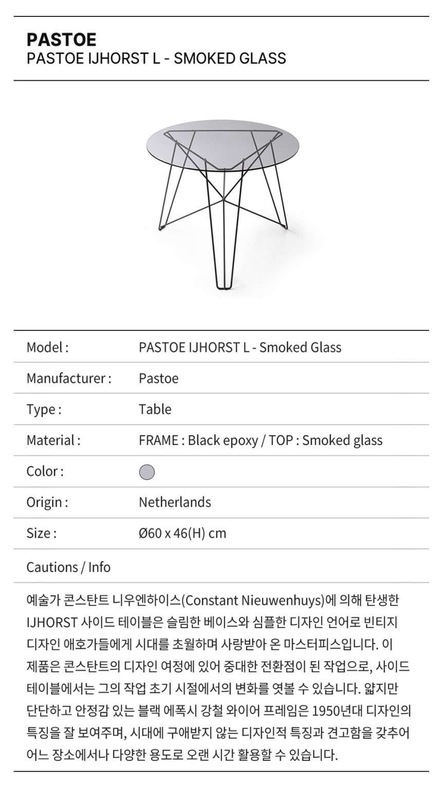 예술가 콘스탄트 니우엔하이스(Constant Nieuwenhuys)에 의해 탄생한 IJHORST 사이드 테이블은 슬림한 베이스와 심플한 디자인 언어로 빈티지 디자인 애호가들에게 시대를 초월하며 사랑받아 온 마스터피스입니다. 이 제품은 콘스탄트의 디자인 여정에 있어 중대한 전환점이 된 작업으로, 사이드 테이블에서는 그의 작업 초기 시절에서의 변화를 엿볼 수 있습니다. 얇지만 단단하고 안정감 있는 블랙 에폭시 강철 와이어 프레임은 1950년대 디자인의 특징을 잘 보여주며, 시대에 구애받지 않는 디자인적 특징과 견고함을 갖추어 어느 장소에서나 다양한 용도로 오랜 시간 활용할 수 있습니다.