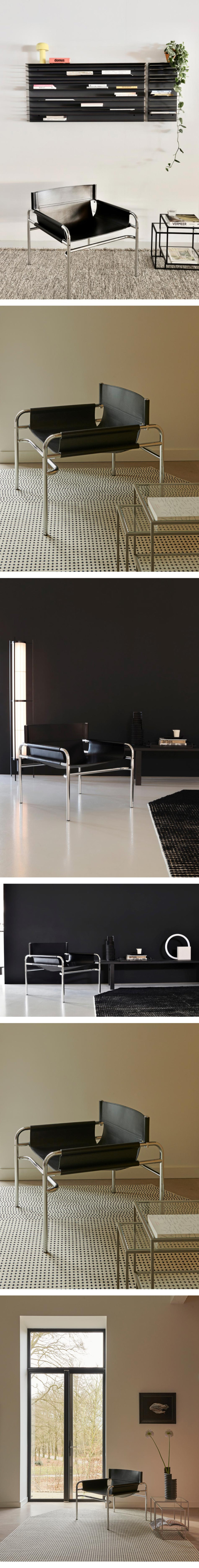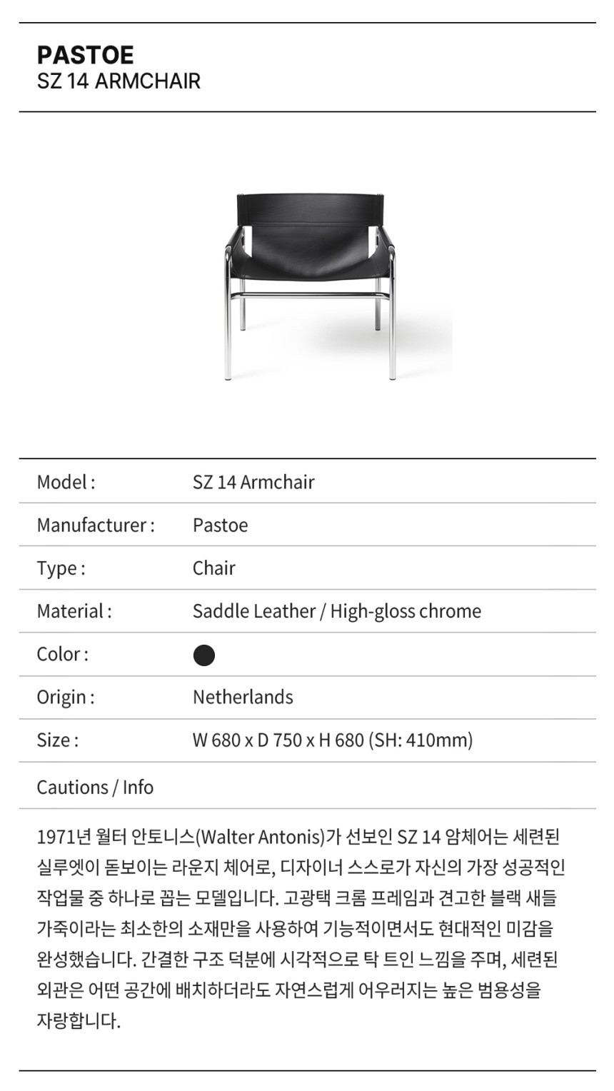1971년 월터 안토니스(Walter Antonis)가 선보인 SZ 14 암체어는 세련된 실루엣이 돋보이는 라운지 체어로, 디자이너 스스로가 자신의 가장 성공적인 작업물 중 하나로 꼽는 모델입니다. 고광택 크롬 프레임과 견고한 블랙 새들 가죽이라는 최소한의 소재만을 사용하여 기능적이면서도 현대적인 미감을 완성했습니다. 간결한 구조 덕분에 시각적으로 탁 트인 느낌을 주며, 세련된 외관은 어떤 공간에 배치하더라도 자연스럽게 어우러지는 높은 범용성을 자랑합니다.