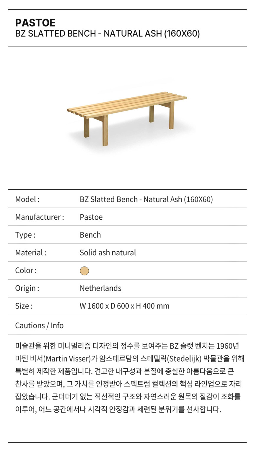 미술관을 위한 미니멀리즘 디자인의 정수를 보여주는 BZ 슬랫 벤치는 1960년 마틴 비서(Martin Visser)가 암스테르담의 스테델릭(Stedelijk) 박물관을 위해 특별히 제작한 제품입니다. 견고한 내구성과 본질에 충실한 아름다움으로 큰 찬사를 받았으며, 그 가치를 인정받아 스펙트럼 컬렉션의 핵심 라인업으로 자리 잡았습니다. 군더더기 없는 직선적인 구조와 자연스러운 원목의 질감이 조화를 이루어, 어느 공간에서나 시각적 안정감과 세련된 분위기를 선사합니다.