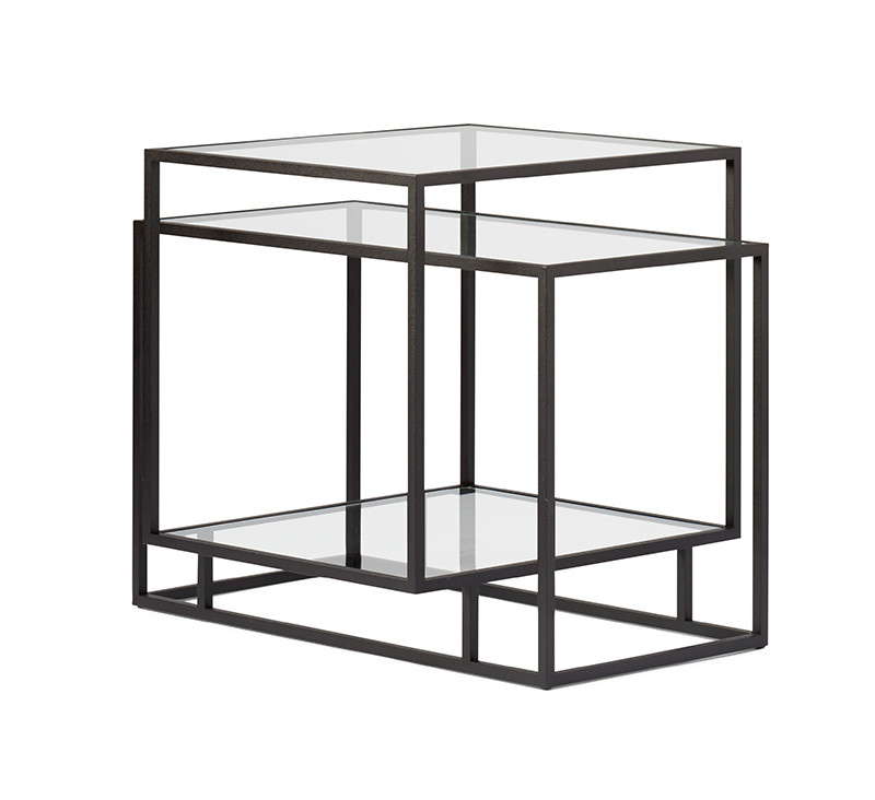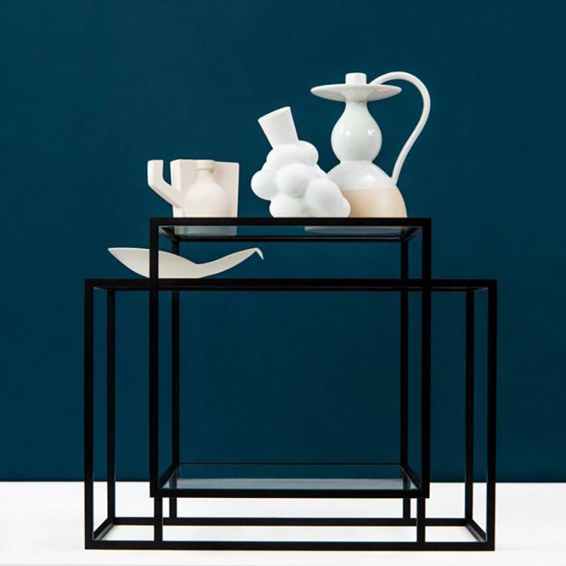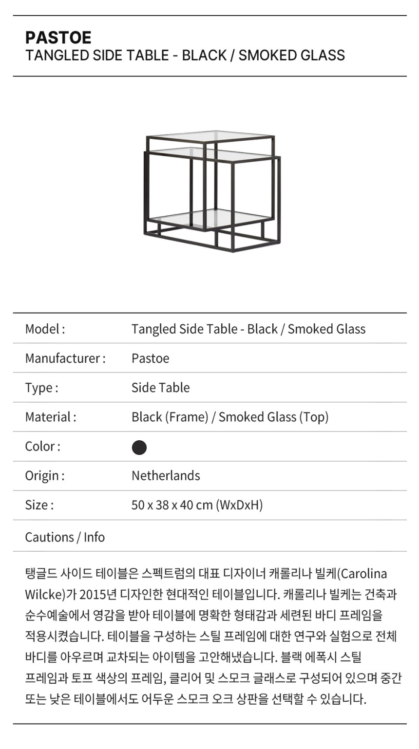 탱글드 사이드 테이블은 스펙트럼의 대표 디자이너 캐롤리나 빌케(Carolina Wilcke)가 2015년 디자인한 현대적인 테이블입니다. 캐롤리나 빌케는 건축과 순수예술에서 영감을 받아 테이블에 명확한 형태감과 세련된 바디 프레임을 적용시켰습니다. 테이블을 구성하는 스틸 프레임에 대한 연구와 실험으로 전체 바디를 아우르며 교차되는 아이템을 고안해냈습니다. 블랙 에폭시 스틸 프레임과 토프 색상의 프레임, 클리어 및 스모크 글래스로 구성되어 있으며 중간 또는 낮은 테이블에서도 어두운 스모크 오크 상판을 선택할 수 있습니다.