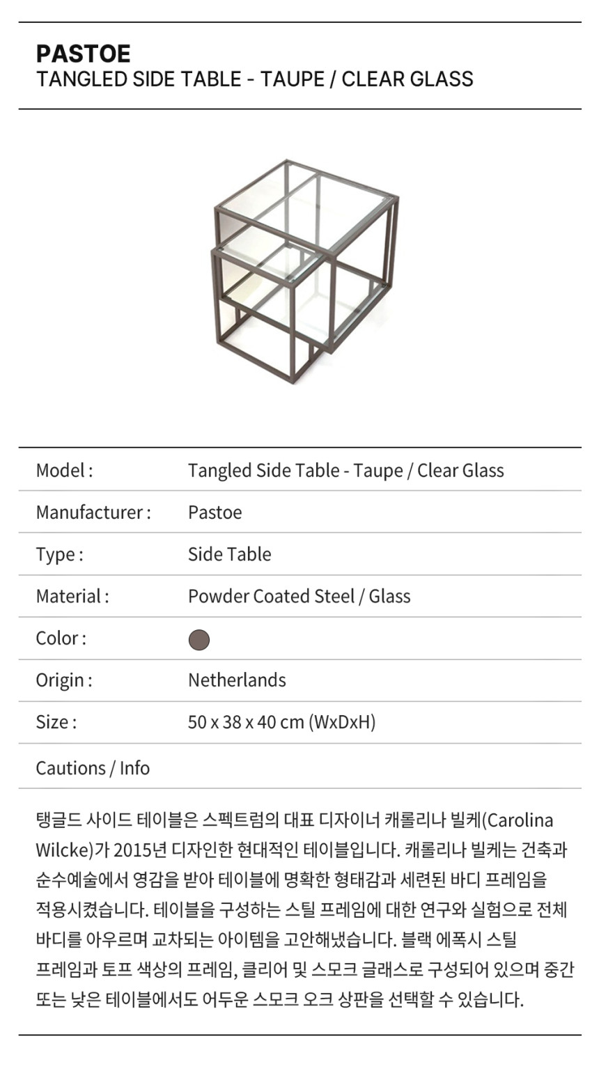 탱글드 사이드 테이블은 스펙트럼의 대표 디자이너 캐롤리나 빌케(Carolina Wilcke)가 2015년 디자인한 현대적인 테이블입니다. 캐롤리나 빌케는 건축과 순수예술에서 영감을 받아 테이블에 명확한 형태감과 세련된 바디 프레임을 적용시켰습니다. 테이블을 구성하는 스틸 프레임에 대한 연구와 실험으로 전체 바디를 아우르며 교차되는 아이템을 고안해냈습니다. 블랙 에폭시 스틸 프레임과 토프 색상의 프레임, 클리어 및 스모크 글래스로 구성되어 있으며 중간 또는 낮은 테이블에서도 어두운 스모크 오크 상판을 선택할 수 있습니다.