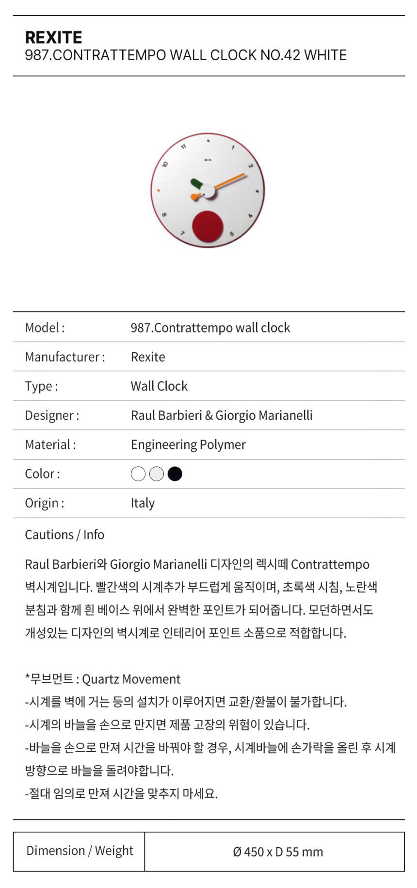 빨간색의 시계추가 부드럽게 움직이며, 초록색 시침, 노란색 분침과 함께 흰 베이스 위에서 완벽한 포인트가 되어 줍니다.