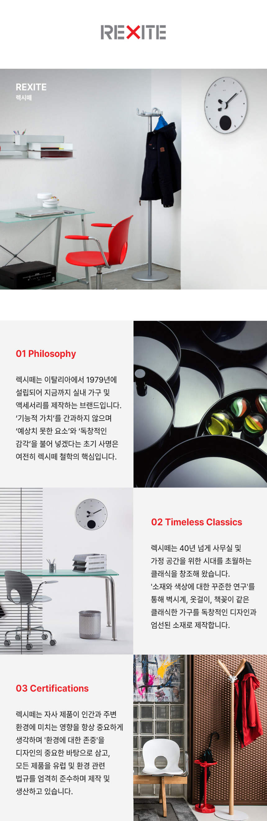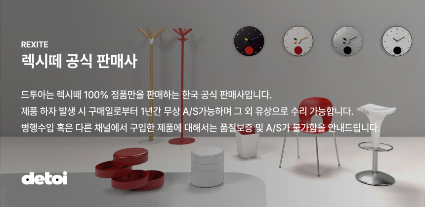 Rexite는 40년 이상을 가구 업계에서 활동하고 있는 기업입니다. 의자, 책상, 책장, 옷걸이, 벽 시계와 클래식한 가구뿐만 아니라 오피스를 위한 가구도 제작하고 있으며 독창성과 높은 품질, 기능성을 앞세어 동종 분야를 이끌어 나가고 있습니다. 기능적 가치와 예상치 못한 아이러니에서 재미를 발견하고, 소재와 색상에 대한 연구, 환경에 대한 존중을 바탕으로 디자인하고 있습니다.