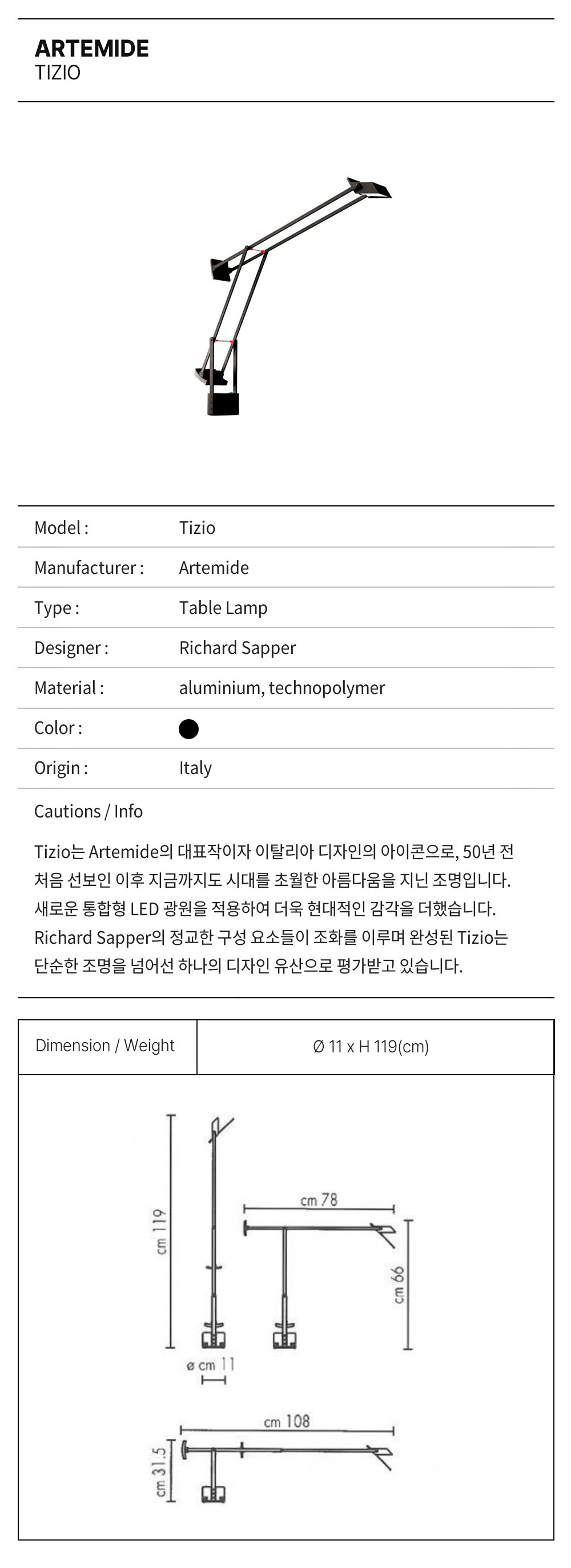 Tizio는 Artemide의 대표작이자 이탈리아 디자인의 아이콘으로, 50년 전 처음 선보인 이후 지금까지도 시대를 초월한 아름다움을 지닌 조명입니다.