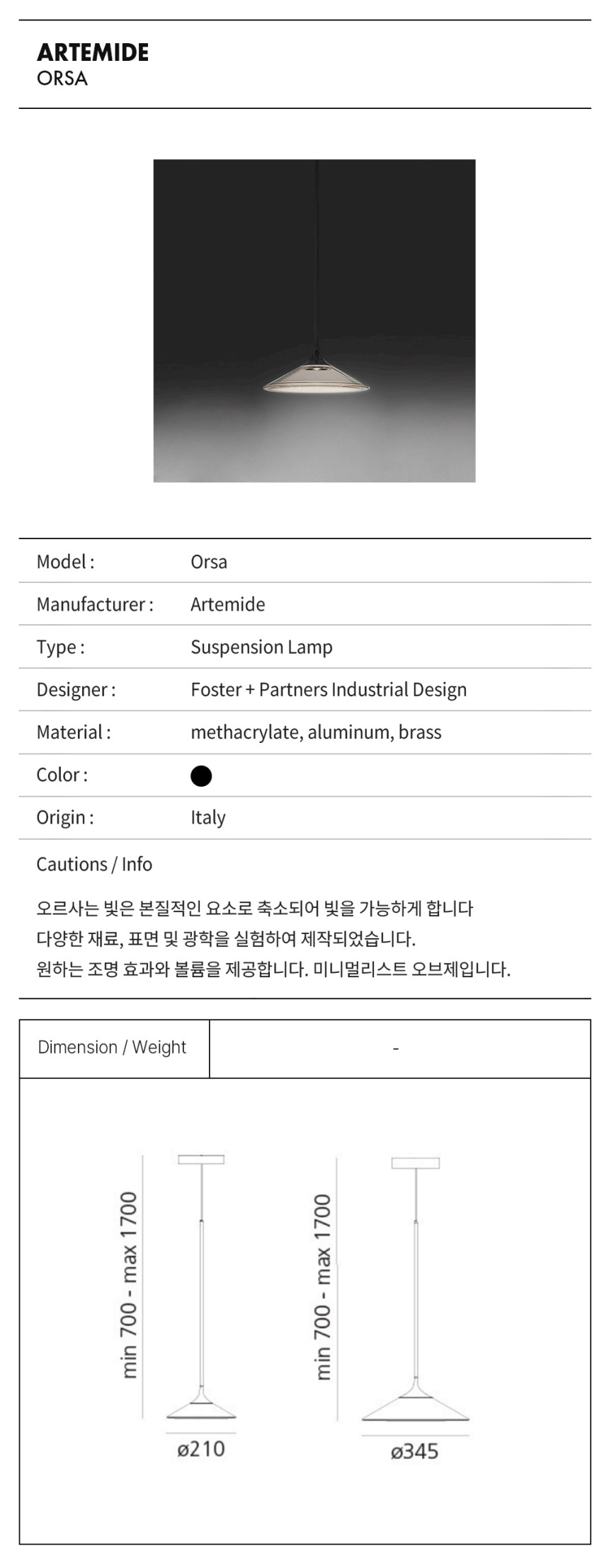 오르사는 정밀도를 구현한 것으로, 우아한 펜던트 빛을 본질적인 요소에 맞게 표현하여 빛이 더 큰 부피를 표현할 수 있도록 한다.