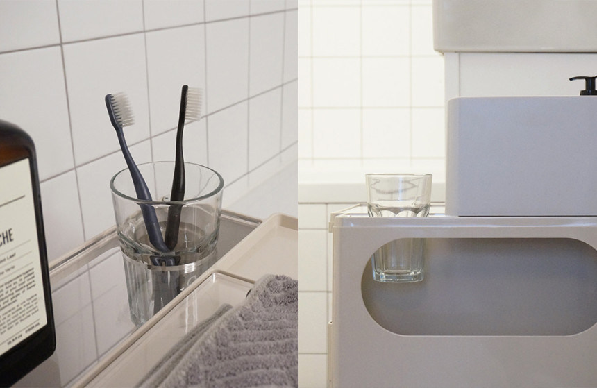 세 개 중 한 피스에는 텀블러나 컵을 꽂을 수 있는 홀이 있어 트롤리의 활용도를 더욱 높여 줍니다.