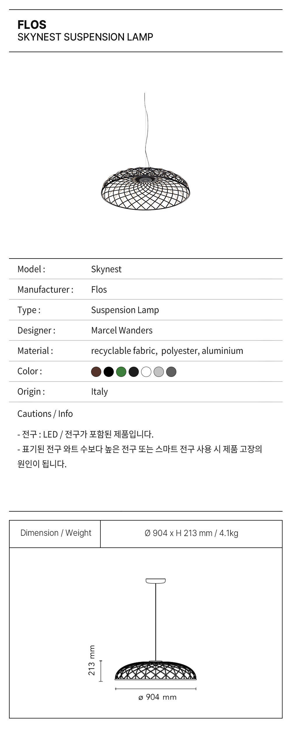 확산형 조명 걸이형 기기입니다. 돔은 빛나는 요소와 어두운 요소가 네트워크 형태로 배열된 형태이며, 재활용 가능한 폴리에스터 소재의 얇고 다채로운 색상의 튜브형 메시로 덮인 핵심 구조로 이루어져 있습니다. 모든 발광 요소는 돔 상단에 위치한 특수 마이크로 커넥터를 통해 구동되며, 투톤 메시로 덮여 있습니다. 돔 안쪽을 향한 면은 LED 모듈에서 최적의 빛을 방출하기 위해 항상 흰색입니다. 돔 상단에는 밸런싱 시스템이 내장되어 있어 균형을 조절하여 완벽한 안정성을 제공합니다. 돔 하단에는 알루미늄 링이 장착되어 있어 간단한 스냅핏 방식으로 돔 전체 네트워크 구조를 제자리에 고정합니다. 이 제품은 접착제를 전혀 사용하지 않고 조립되어 있어 나중에 재활용하거나 수리나 교체할 경우를 대비해 완전히 분리할 수 있습니다.