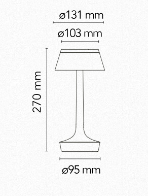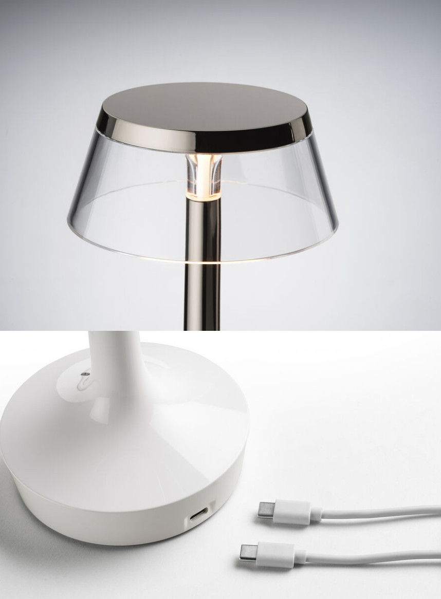 직접 조명을 제공하는 무선 테이블 램프. 사출 성형된 본체와 PMMA 투명 디퓨저. 엣지 라이팅(Edge Lighting) 기술 광원. 6/24시간 배터리 사용, USB C 및 Qi 충전 가능. 베이스에 광학 스위치 센서가 있어 4단계 밝기 조절 기능과 3단계 색온도 조절(2200K, 2700K, 3000K) 기능을 제공합니다. 패키지에 USB-C 충전 케이블이 포함되어 있으며, 사용 가능 길이는 120cm입니다.