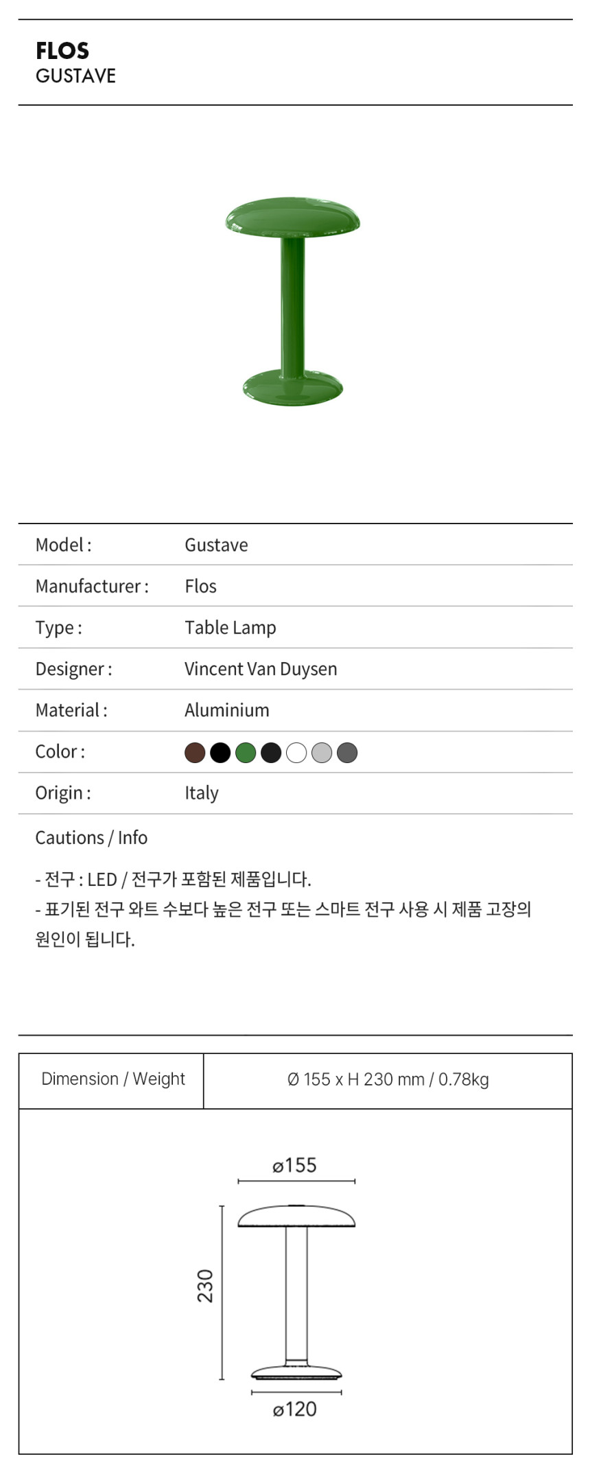 Gustave는 휴대용 자가 구동 조명기구로, 탁상 조명 및 기타 보조 조명용으로 특별히 설계되었습니다. Gustave의 컴팩트한 크기는 혁신적인 광학 및 조명 기술과 혁신적인 엔지니어링의 완벽한 조화를 이루며, Flos의 이 프로젝트에서 핵심적인 목표, 즉 원형 디자인, 친환경성, 그리고 노후화 방지를 고려한 최초의 휴대용 조명기구를 개발하는 것을 목표로 합니다. 가정용으로 설계된 자가 구동 배터리가 장착된 휴대용 조명기구입니다.
