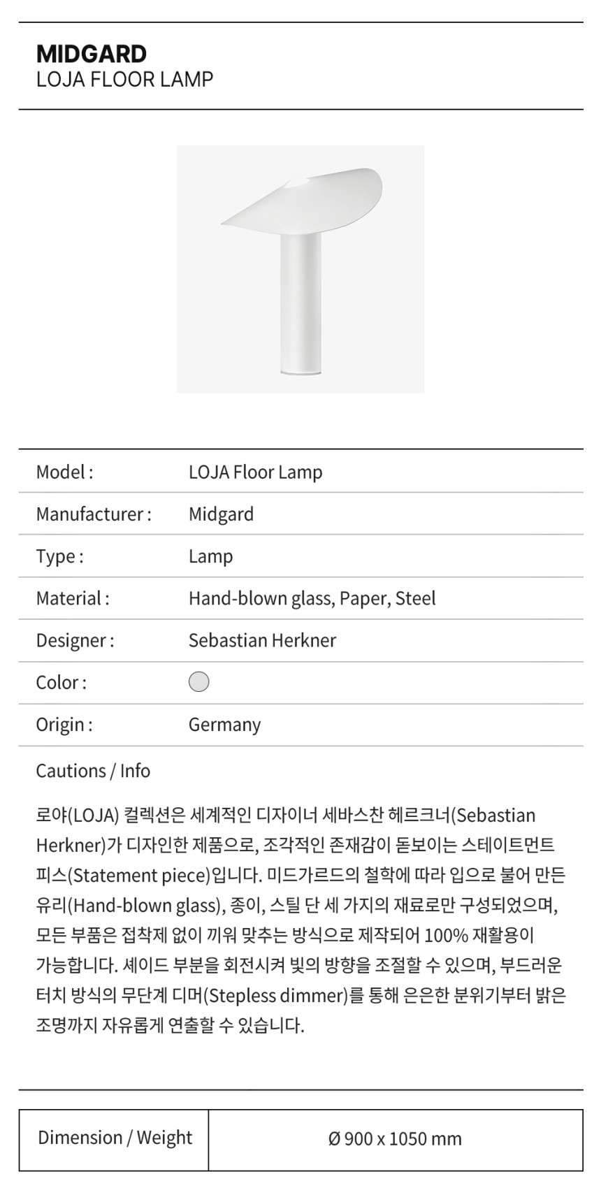 로야(LOJA) 컬렉션은 세계적인 디자이너 세바스찬 헤르크너(Sebastian Herkner)가 디자인한 제품으로, 조각적인 존재감이 돋보이는 스테이트먼트 피스(Statement piece)입니다. 미드가르드의 철학에 따라 입으로 불어 만든 유리(Hand-blown glass), 종이, 스틸 단 세 가지의 재료로만 구성되었으며, 모든 부품은 접착제 없이 끼워 맞추는 방식으로 제작되어 100% 재활용이 가능합니다. 셰이드 부분을 회전시켜 빛의 방향을 조절할 수 있으며, 부드러운 터치 방식의 무단계 디머(Stepless dimmer)를 통해 은은한 분위기부터 밝은 조명까지 자유롭게 연출할 수 있습니다. 사용자가 도구 없이 직접 LED 유닛과 변압기를 교체할 수 있도록 설계되어 지속 가능성까지 고려한 현대적인 조명입니다.