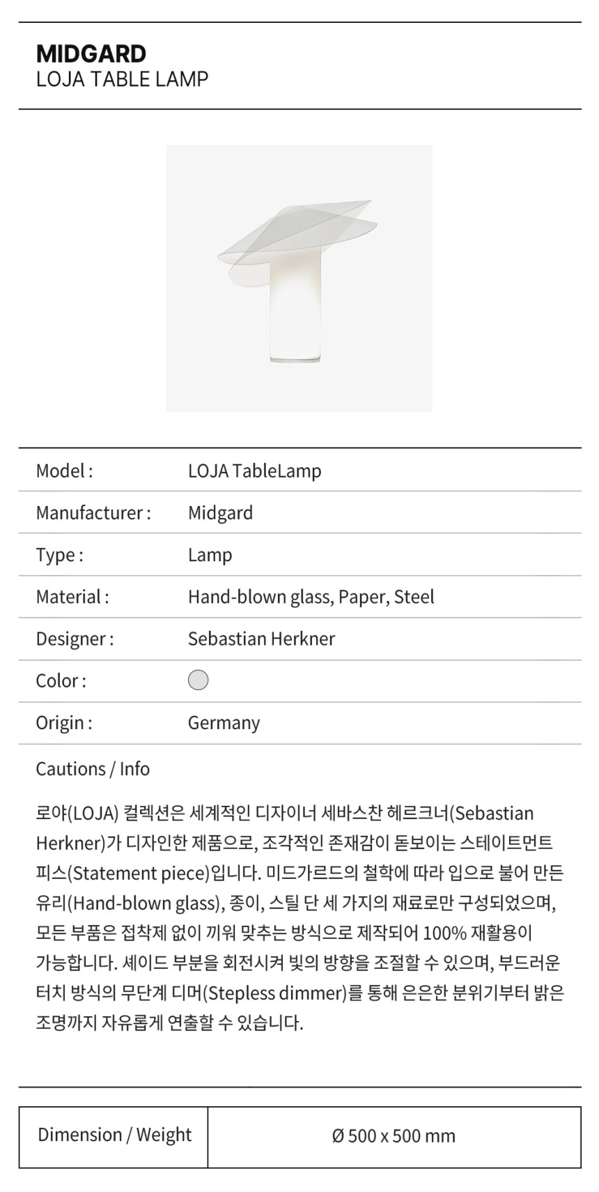 로야(LOJA) 컬렉션은 세계적인 디자이너 세바스찬 헤르크너(Sebastian Herkner)가 디자인한 제품으로, 조각적인 존재감이 돋보이는 스테이트먼트 피스(Statement piece)입니다. 미드가르드의 철학에 따라 입으로 불어 만든 유리(Hand-blown glass), 종이, 스틸 단 세 가지의 재료로만 구성되었으며, 모든 부품은 접착제 없이 끼워 맞추는 방식으로 제작되어 100% 재활용이 가능합니다. 셰이드 부분을 회전시켜 빛의 방향을 조절할 수 있으며, 부드러운 터치 방식의 무단계 디머(Stepless dimmer)를 통해 은은한 분위기부터 밝은 조명까지 자유롭게 연출할 수 있습니다. 사용자가 도구 없이 직접 LED 유닛과 변압기를 교체할 수 있도록 설계되어 지속 가능성까지 고려한 현대적인 조명입니다.