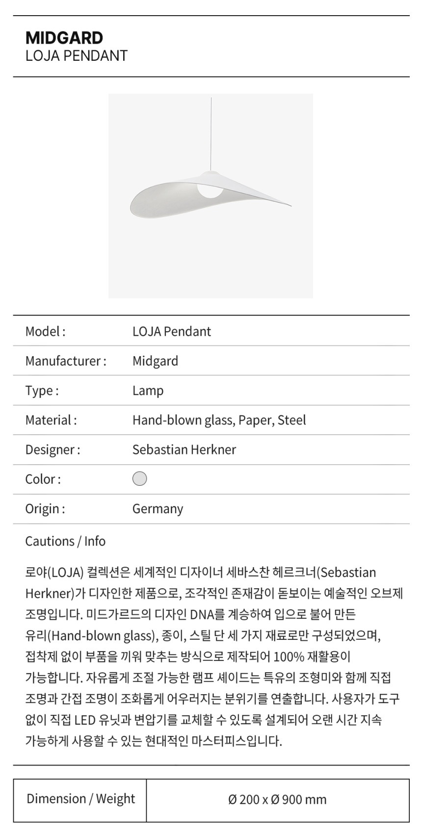 로야(LOJA) 컬렉션은 세계적인 디자이너 세바스찬 헤르크너(Sebastian Herkner)가 디자인한 제품으로, 조각적인 존재감이 돋보이는 예술적인 오브제 조명입니다. 미드가르드의 디자인 DNA를 계승하여 입으로 불어 만든 유리(Hand-blown glass), 종이, 스틸 단 세 가지 재료로만 구성되었으며, 접착제 없이 부품을 끼워 맞추는 방식으로 제작되어 100% 재활용이 가능합니다. 자유롭게 조절 가능한 램프 셰이드는 특유의 조형미와 함께 직접 조명과 간접 조명이 조화롭게 어우러지는 분위기를 연출합니다. 사용자가 도구 없이 직접 LED 유닛과 변압기를 교체할 수 있도록 설계되어 오랜 시간 지속 가능하게 사용할 수 있는 현대적인 마스터피스입니다.