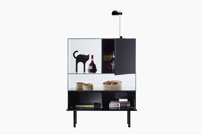 투명한 유리 선반 위에는 블랙 컬러로 칠한 수납 칸이 있는데, 접이식 선반이 딸린 이 수납 칸은 보이지 않는 수납을 가능하게 해줍니다.
