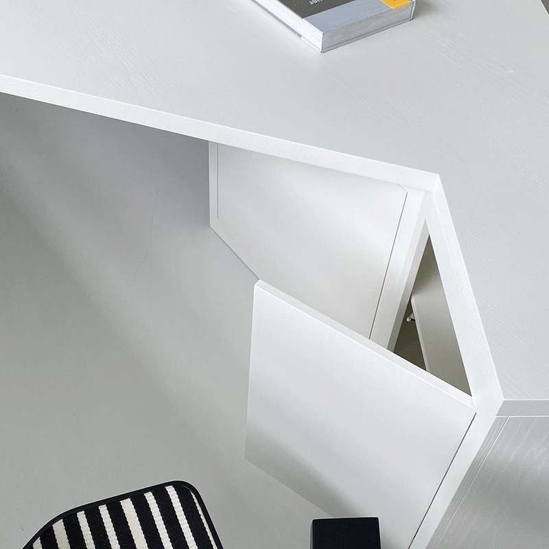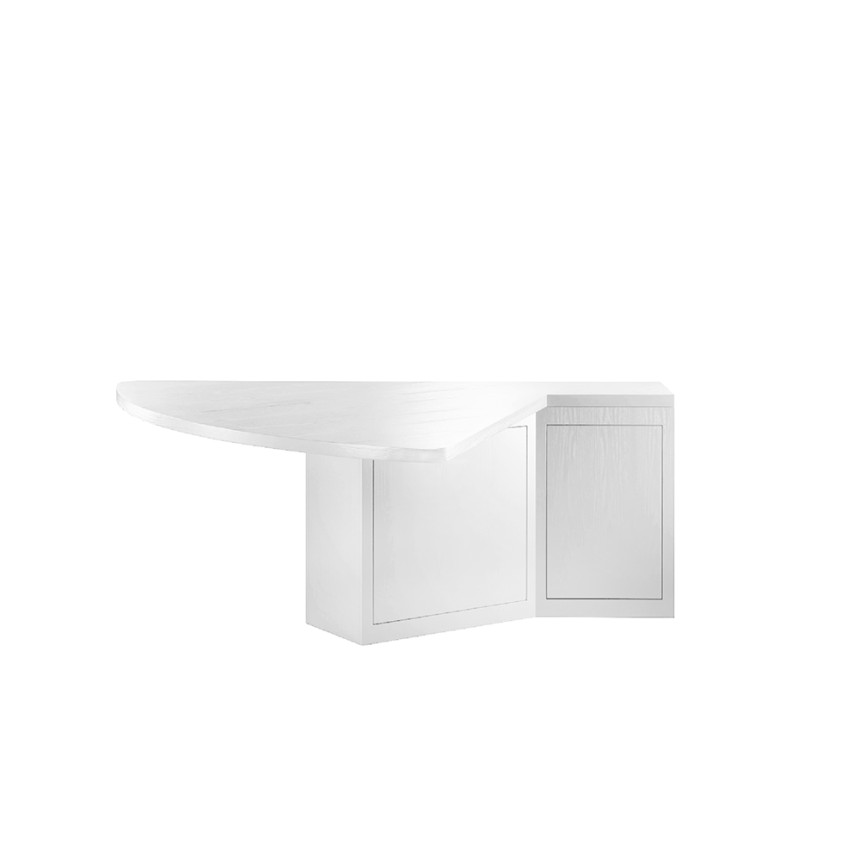 마치 팬 모양의 테이블 상부 표면은 일반 테이블처럼 일렬로 앉거나 둥글게 앉는 틀을 벗어나 한쪽 부분은 소 그룹으로 다른 반대편은 큰 그룹별로 최대 7-8명의 인원 착석이 가능합니다. 옵션에 따라 회전식 수납장을 추가하여 실용적으로 사용할 수 있어 오피스의 사무용, 회의용 테이블로 사용하기에도 적합합니다.
