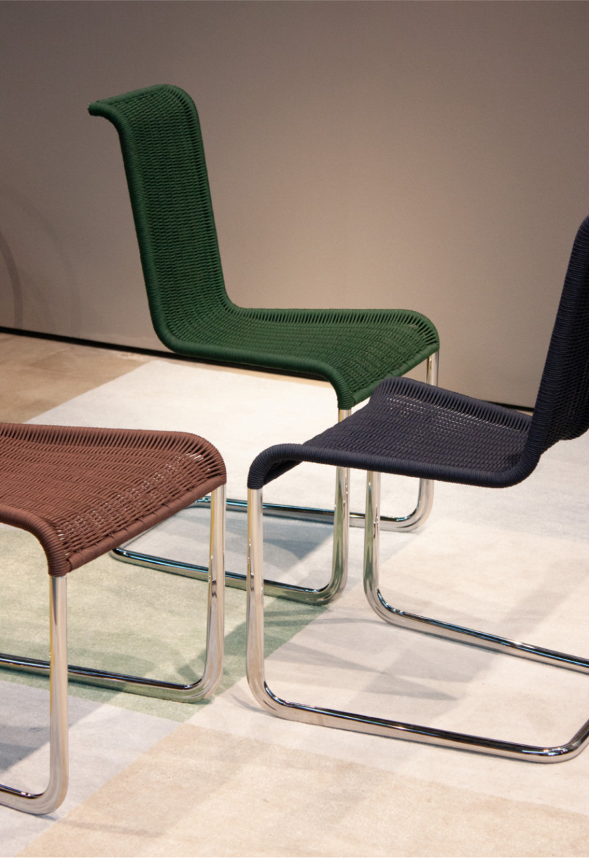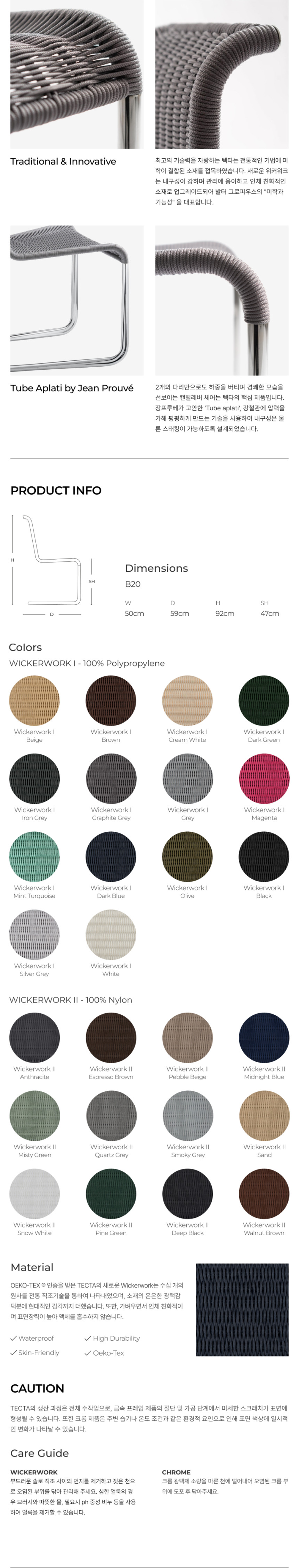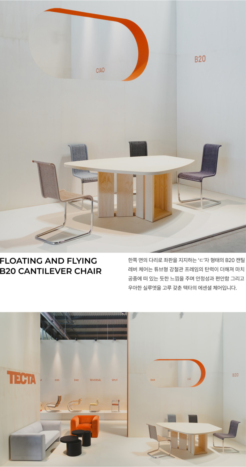 B20 캔틸레버 체어는 바우하우스 디자인을 계승하고, 이를 토대로 지속 가능성을 지닌 강철관 가구를 전개하는 독일 텍타의 핵심 제품 중 하나입니다. 캔틸레버 체어는 일반적인 4개의 다리로 지지하는 방식이 아닌 한 쪽 면은 고정되어 있고 반대쪽 면은 공중에 떠있는 형태의 의자로, 최초의 형태는 네덜란드의 건축가 마트 스탐이 고안했습니다. TECTA B20 체어는 초기 Stefan Wewerka 스테판 베베카가 디자인한 제품이며 B20을 비롯해 텍타에서 디자인한 캔틸레버 체어는 장 프루베가 고안한 튜브 아플라티(압력을 강해 평평하게 누른 강철관)로 프레임을 제작해 내구성이 뛰어나고 아름다우며 스태킹이 가능한 점이 특징입니다. 피부친화적이고 내마모성이 뛰어난 소재인 Öko-Tex 소재의 New Wickerwork를 사용합니다.